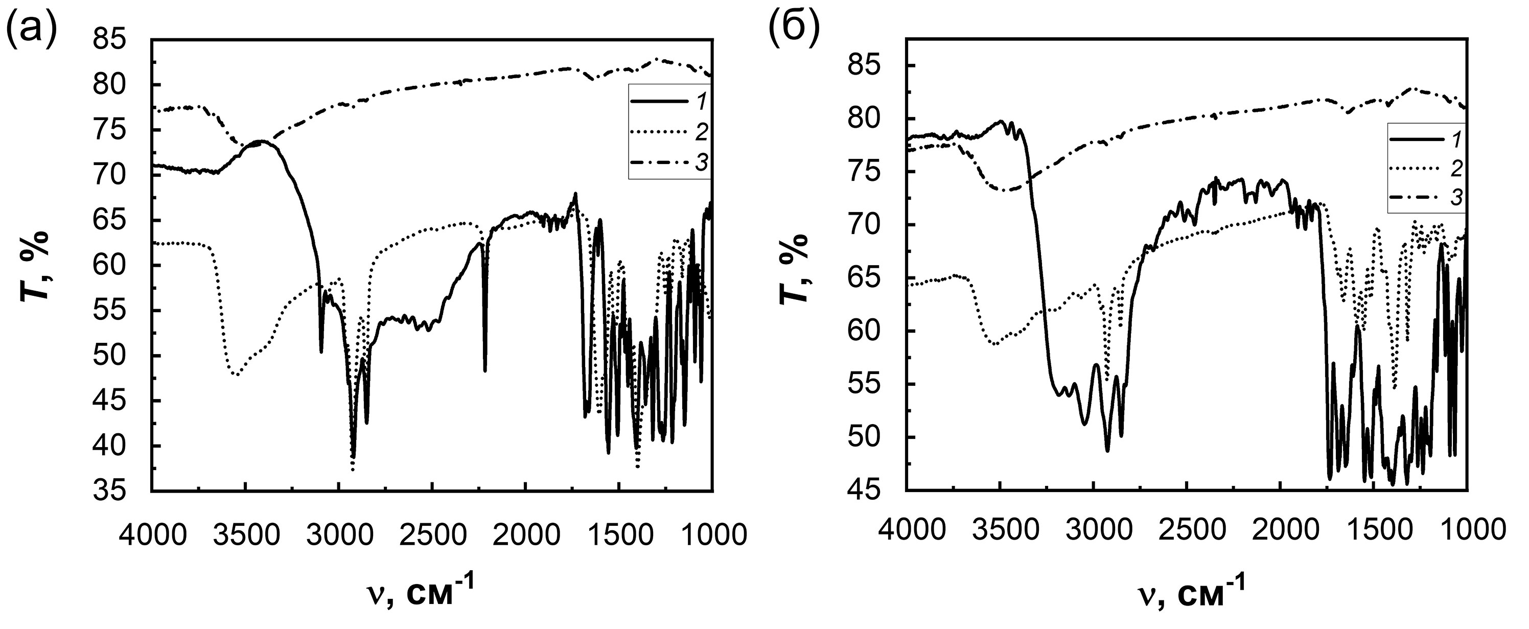 Рис. 6. ИК-спектры пропускания красителей IS 4 (a) и IS 9 (б), адсорбированных на поверхности ZnO: 1 – краситель; 2 – краситель на ZnO; 3 – ZnO.
