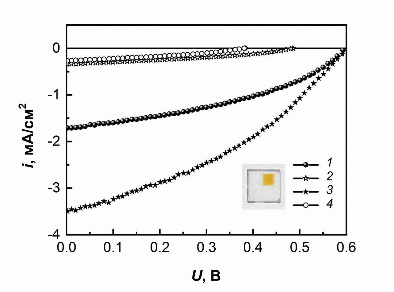 Вольт-амперные характеристики (ВАХ) для полученных фотоанодов с красителями IS 4 и IS 9 были измерены для образцов 1–4. Их описание приведено в табл. 1.