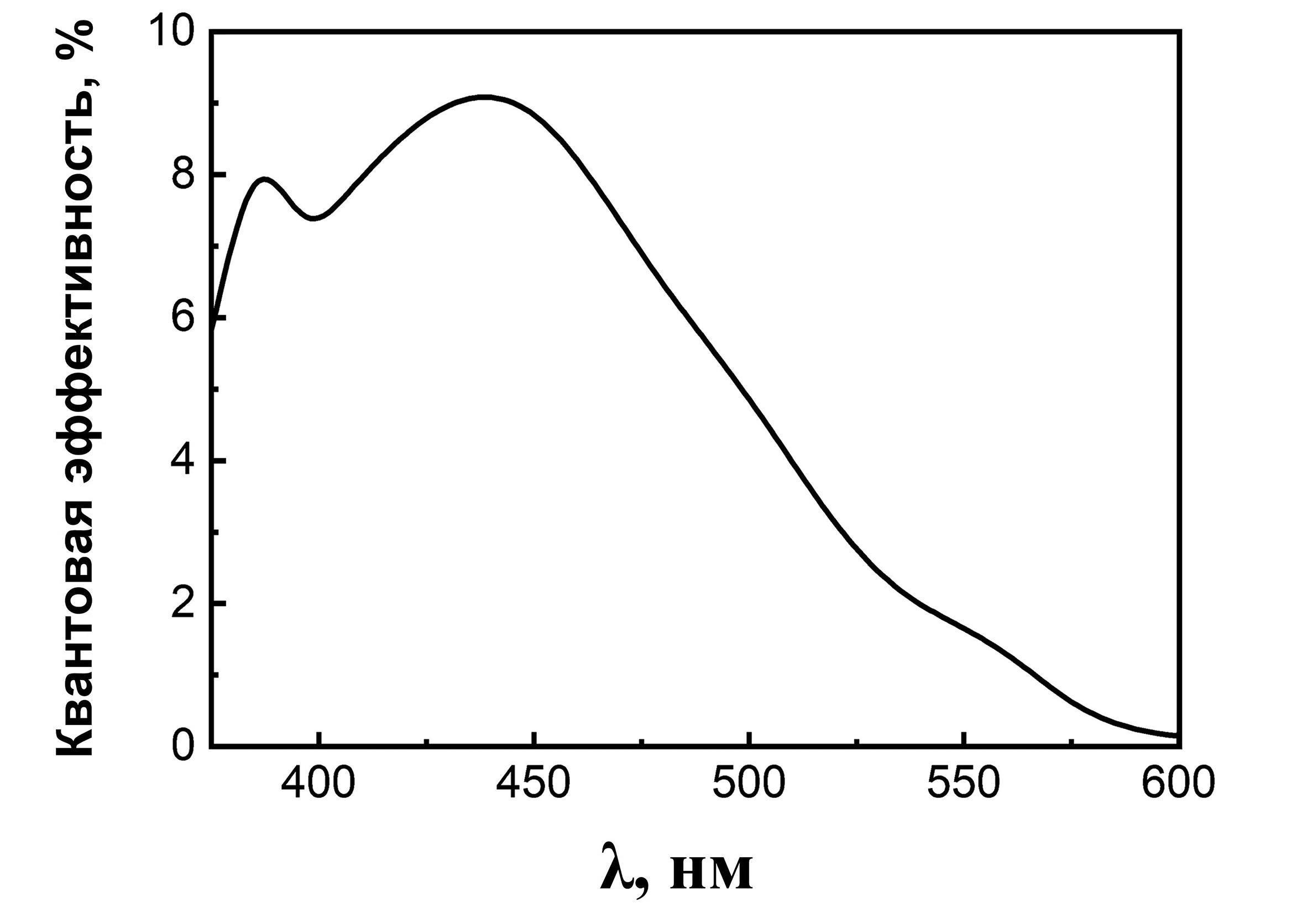 Для фотоанода с наностержнями ZnO длиной 2.5 мкм и адсорбированным красителем IS 4 был измерен спектр квантовой эффективности, который представлен на рис. 8. Основной спектральный диапазон охватывает область 350–600 нм с максимальным значением ~9% при длине волны 450 нм.