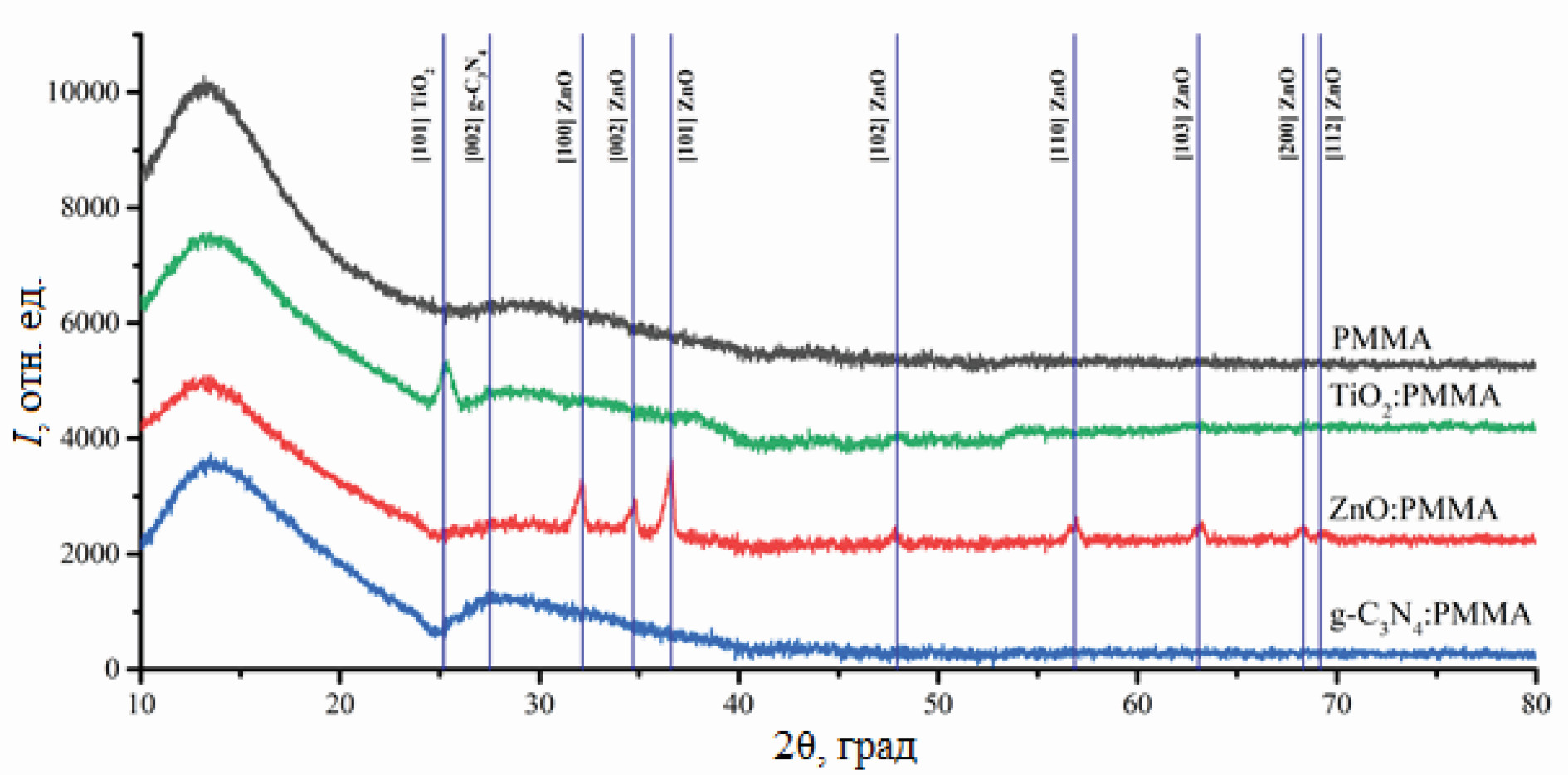 Во всех композитах сохранились и кристаллическая решетка, и средний размер кристаллитов исходных полупроводников. В табл. 2 приведены данные XRD-анализа исходных порошков исследуемых полупроводников с идентификацией кристаллических фаз, соответствующих определенным дифракционным пикам, а на рис. 4 представлены дифрактограммы синтезированных композитов. В диапазоне углов 10°–40° на всех дифрактограммах ярко выражены две широкие полосы, относящиеся к PMMA, которые по интенсивности перекрывают рефлексы от кристаллитов g-C3N4 в направлениях [100] и [002].