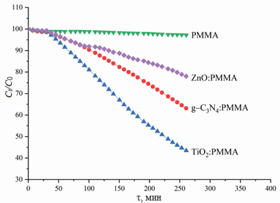 Фотокаталитическую активность синтезированных композитов иллюстрируют экспериментальные данные, представленные на рис. 5. Исходная концентрация красителя в водном растворе принята за 100%. Очевидно, что собственные фотокаталитические свойства у PMMA отсутствуют. Это позволяет интерпретировать наблюдаемое уменьшение концентрации красителя с увеличением продолжительности УФ-облучения, использованного для инициирования фотокатализа, как результат деструктурирующего воздействия на его молекулы подвижных носителей заряда, генерируемых в наночастицах TiO2, ZnO, g-C3N4. Полное обесцвечивание раствора тестового красителя достигнуто за 17, 10 и 6.5 ч с использованием композитов, содержащих ZnO, g-C3N4, TiO2 соответственно.