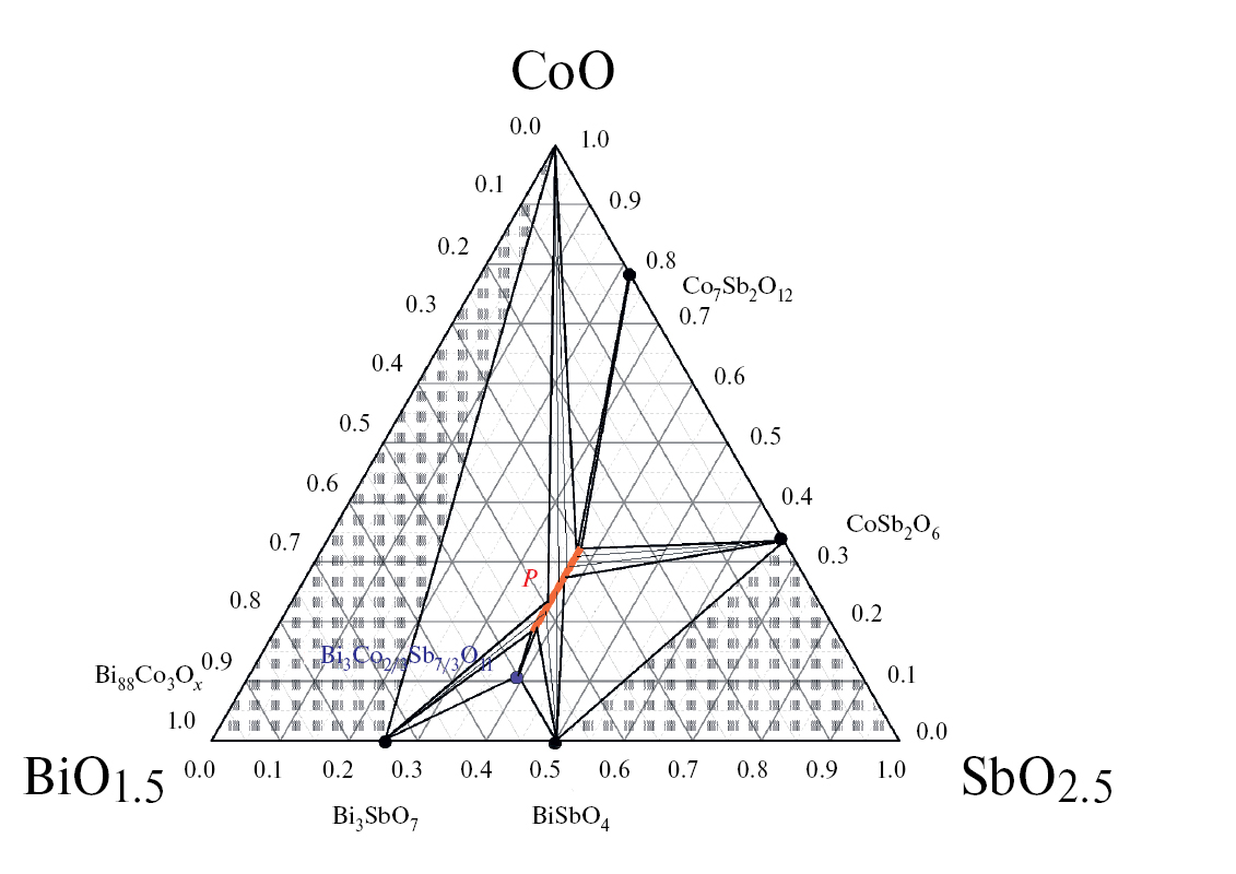 Таким образом, область CoO–Bi3SbO7–CoSb2O6–BiSbO4 можно рассматривать как часть тройной системы Bi2O3–CoO–Sb2O5 в отличие от областей, заштрихованных на рис. 1, в которых кобальт и сурьма находятся в смешанных степенях окисления. Изотермическое сечение системы в области CoO–Bi3SbO7–BiSbO4–CoSb2O6 при 650°С может быть представлено в виде семи треугольников сосуществующих фаз: CoO–Bi3SbO7–P, Bi3SbO7–P–Bi3Co2/3Sb7/3O11, Bi3SbO7–Bi3Co2/3Sb7/3O11–BiSbO4, BiSbO4–Bi3Co2/3Sb7/3O11–P, BiSbO4–P–CoSb2O6, BiSbO4–CoSb2O6–Sb2O5, CoSb2O6–P–Co7Sb2O12, P–Co7Sb2O12–CoO.