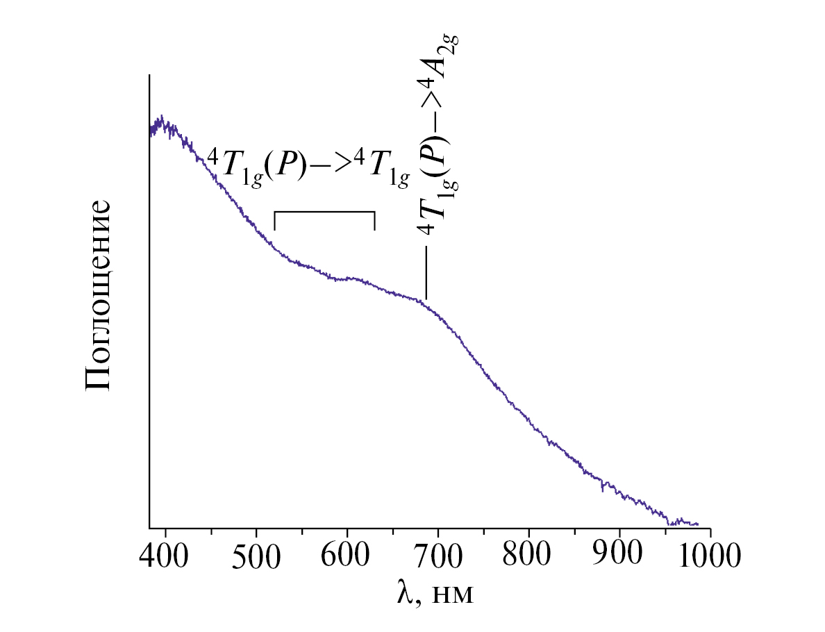 Спектр диффузного отражения в видимой области образца Bi1.5CoSb1.5O7 (рис. 3) подтвердил, что кобальт находится в степени окисления 2+. В спектре наблюдается интенсивная полоса в области 500–650 нм, связанная с разрешенным переходом 4T1g(P) → 4T1g. Мультиплетная структура этой полосы объясняется примешиванием запрещенных по спину переходов. Также в области 700 нм фиксируется полоса, соответствующая переходу 4T1g(P) → 4A2g, часто имеющему вид плеча на низкоэнергетической стороне полосы перехода 4T1g(P) → 4T1g [23].