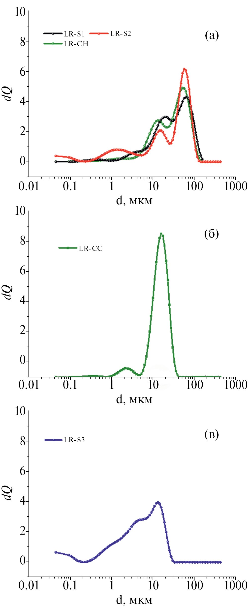 Оксиды, полученные из гидроксидных прекурсоров (рис. 2в–2д) обоими методами, состоят из бесформенных крупных агломератов, размерные фракции которых примерно совпадают (рис. 3а). Кривые дифференциального распределения размеров этих агломератов бимодальны (для образца LR-S2 тримодальны) и соответствуют агломератам с размерами 20 и 60 мкм (для LR-S2 дополнительная мелкая фракция с размером агломератов ~1.5 мкм).