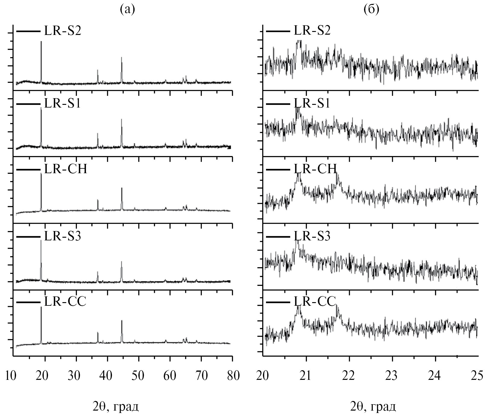 Рис. 4. Дифрактограммы литированных образцов (а), увеличенная область 20°–25° 2θ (б).