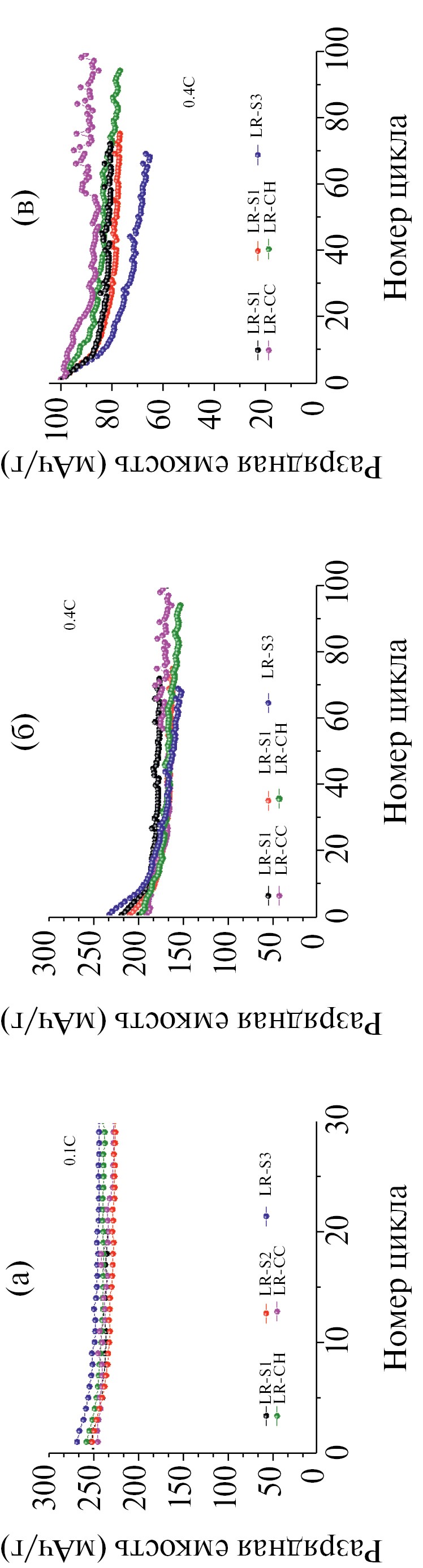 В ходе гальваностатического циклирования при 0.1С (рис. 5а) все образцы показали высокие значения удельной разрядной емкости. Начальная разрядная емкость образцов, как и емкость после 50 циклов, находится в узком интервале значений; остаточная емкость в процентах после циклирования лежит в интервале 89.0–94.0%. При увеличении тока заряда/разряда до 0.4С (рис. 5б) удельная разрядная емкость снижается, а ее значения сильно отличаются для разных образцов; остаточная емкость после 65 циклов варьируется в интервале от 66.1 до 89.4% (рис. 5в). Основное отличие образцов – их различная морфология и размеры, что может повлиять на пути диффузии ионов лития; на это указывает большее различие электрохимических параметров при более высокой скорости циклирования. Это подтверждают и данные для образца LR-S3, синтезированного из оксалатного прекурсора, который обладает наименьшими размерами агломератов (табл. 2). Для указанного образца характерны максимальные значения емкости при циклировании и сравнимое с образцом LR-CH значение в режиме 0.1С, тогда как при 0.4С этот образец демонстрирует наиболее сильное падение емкости (рис. 5 в). На наш взгляд, это связано с размерами агломератов. Образцы, состоящие из более мелких агломератов, в силу укорочения диффузионного пути обладают более высокими значениями емкости, но в то же время быстрее деградируют из-за увеличения площади соприкосновения материала с электролитом (протекание побочных реакций) и более быстрого разрушения агломератов вследствие происходящих структурных перестроек. Все материалы, синтезированные из гидроксидных прекурсоров (LR-CH, LR-S1, LR-S2), показали приблизительно одинаковое сохранение емкости во времени. Образец, чья остаточная емкость относительно первого цикла осталась в прежних пределах – LR-CC, что говорит о более стабильной кристаллической структуре этого образца, полученного из карбонатного прекурсора и обладающего сферической формой агломератов.