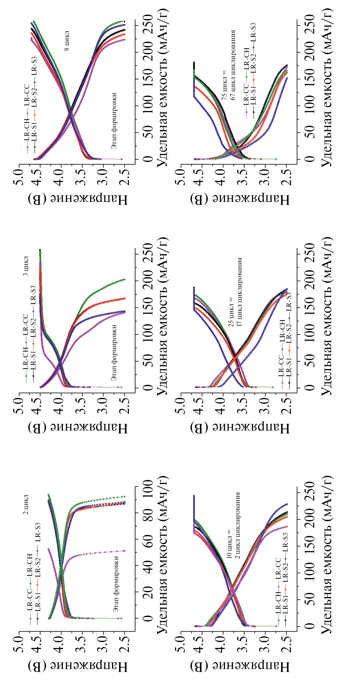 Кривые первой производной емкости по напряжению от напряжения (dQ/dV) приведены на рис. 8 для образцов LR-CH, LR-CC, LR-S3 и LR-S1 (2 и 67 циклы) и более очевидно демонстрируют изменения, происходящие со структурой материала при циклировании. На 2 цикле кривые образцов схожи (рис. 8а). Эти образцы уже прошли этап формировки, в процессе которой произошла структурная перестройка, когда из фазы Li2MnO3 при напряжении >4.5 В в процессе извлечения лития одновременно происходит окисление кислорода (с его возможным выделением) и перегруппировка переходных металлов [31, 32].
