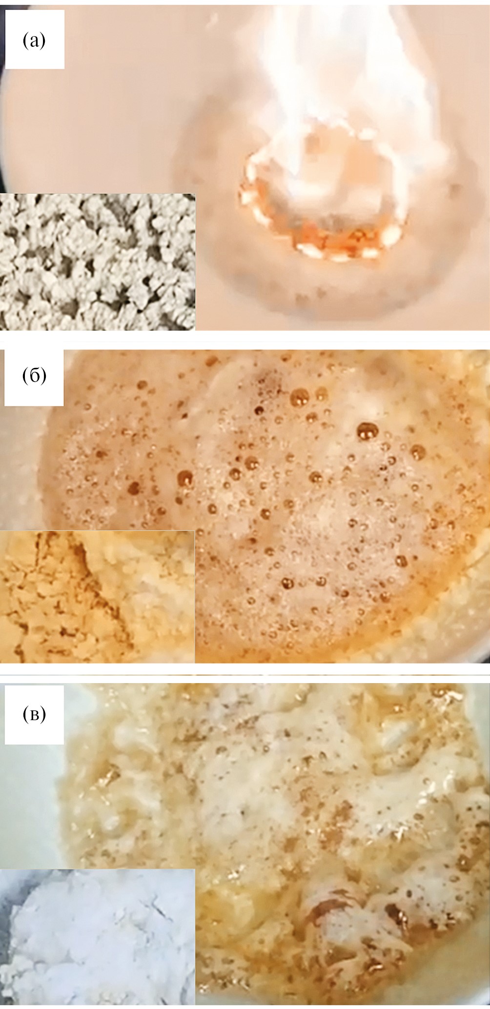 Полученные глицин-, крахмал- и ПВС-нитратный прекурсоры были обозначены как ГНП, КНП и ПНП соответственно. Нагревание каждого из них при температуре ~90°C приводило к формированию плотной вязкой массы (рис. 1а–1в) и сопровождалось активным выделением газообразных продуктов. По мере удаления растворителя из КНП и ПНП образовывался желтоватый порошок (рис. 1б, 1в). В случае ГНП наблюдалось возгорание гелеобразной массы, которое завершалось образованием серо-желтого порошка (рис. 1а).