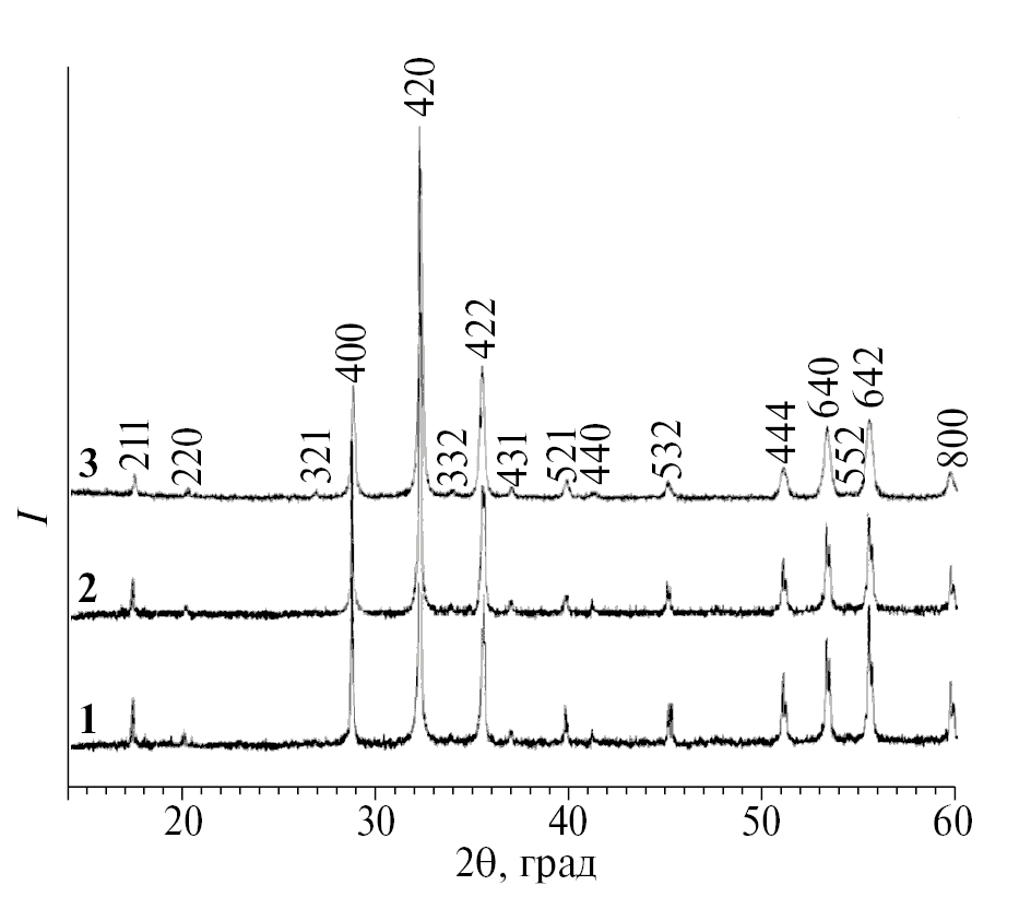 Как следует из результатов РФА, после синтеза и отжига на воздухе при 1023 K порошок Y3(Fe0.5Ga0.5)5O12 не содержит примесей (рис. 1, дифрактограмма 1). Y2.5Ce2.5(Fe0.5Ga0.5)5O12 (рис. 1, дифрактограмма 2) после отжига в вакууме при 1023 K также является однофазным и характеризуется отсутствием примеси CeO2. После синтеза в вакууме и последующей термической обработки на воздухе при 1023 K в течение 5 ч в образце Y2.5Ce2.5(Fe0.5Ga0.5)5O12 не обнаружено примесных фаз (рис. 1, дифрактограмма 3). Это может свидетельствовать о достаточно высокой термической устойчивости синтезированного Y2.5Ce0.5(Fe0.5Ga0.5)5O12.