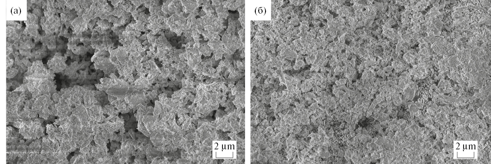 Рис. 3. РЭМ-изображение Y2.5Ce0.5(Fe0.5Ga0.5)5O12 после синтеза и отжига в вакууме (а) и последующего отжига на воздухе (б)