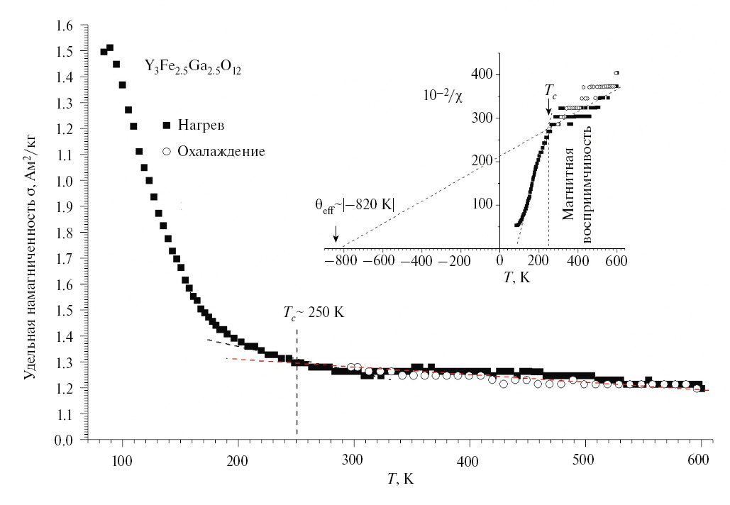 На рис. 4 представлена температурная зависимость удельной намагниченности и обратной величины удельной магнитной восприимчивости Y3(Fe0.5Ga0.5)5O12. Эксперимент показывает, что магнитный фазовый переход к ферримагнитному состоянию в Y3(Fe0.5Ga0.5)5O12 происходит при 250 K. Для сравнения: железоиттриевый гранат Y3Fe5O12 является ферромагнетиком с температурой Кюри (ТС) 558.9 K [24]. Замена части ионов железа в решетке феррограната на ионы галлия приводит к усилению в Y3(Fe0.5Ga0.5)5O12 антиферромагнитного упорядочения с достаточно высокой температурой Ɵэф Кюри–Вейса. Это наглядно показывает зависимость 10–2/χ = f(Т) (вставки на рис. 4 и 5).