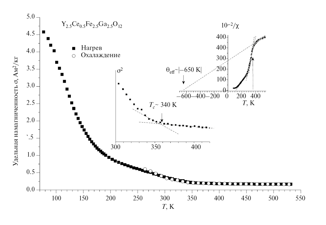 На рис. 5 представлены результаты температурных зависимостей удельной намагниченности (σ) и обратной величины удельной магнитной восприимчивости (10–2/χ = f(T)) для состава Y2.5Ce0.5(Fe0.5Ga0.5)5O12 после синтеза и отжига в вакууме при 1023 K в течение 2 ч.