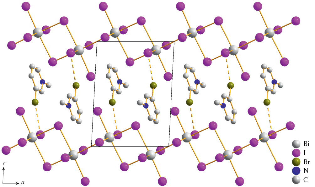 Синтез 2. Навески 30 мг BiI3 (0.05 ммоль) и 15 мг (0.05 ммоль) 3-бром-1-метилпиридиния иодистого растворяли в 8 мл смеси растворителей ацетонитрил : ацетон (1 : 1) при нагревании до 70°C в течение 1 ч. После растворения в смесь добавляли 5 мл этилового спирта. Далее медленно охлаждали до комнатной температуры и выдерживали в течение суток. Получен красный кристаллический осадок. Выход 62%. В расчете на C6H7NBrBiI4 вычислено, %: C 8.1; H 0.8; N 1.6. Найдено, %: C 8.3; H 0.8; N 1.7.