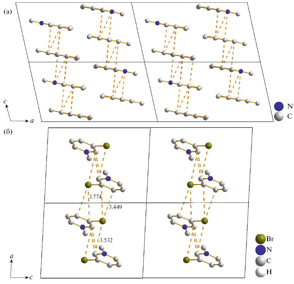 Соединения 1 и 2, полученные в смеси ацетона и ацетонитрила, кристаллизуются в моноклинной и триклинной сингонии соответственно. Асимметричная часть ячейки обоих соединений содержит один катион и один фрагмент {BiI4}. Анион представляет собой зигзагообразные цепи, сформированные октаэдрами {BiI6}, связанными между собой через два μ2-иодидных лиганда. В структуре 1 эти цепи расположены вдоль кристаллографической оси с (рис. 1). Данный структурный тип известен в химии иодовисмутатов(III) [27–29], хотя встречается сравнительно редко. В 1 и 2 расстояния Bi–Iтерм составляют 2.9189(5)–2.9318(6) и 2.9071(3)–2.9130(4) Å, Bi–Iμ2 – 3.0366(4)–3.2569(5) и 3.0595(3)–3.2840(4) Å соответственно. Анализ структуры 1 не позволяет предположить наличие нековалентных взаимодействий между атомами галогенов – минимальное расстояние I···I составляет 3.9804(7) Å, что несколько больше суммы соответствующих ван-дер-ваальсовых радиусов по Бонди (3.96 Å) [30]. В то же время структура 2 отличается большим разнообразием подобных контактов. Так, взаимодействия Br···I (3.7440(8) Å при сумме ван-дер-ваальсовых радиусов 3.81 Å) связывают катион с одним из терминальных иодидных лигандов (рис. 2). Одновременно с этим наблюдаются и контакты I···I (3.7714(4) Å) между соседними полимерными цепочками {[BiI4]}n–. Отдельно стоит отметить наличие стекинг-взаимодействий между катионами в структурах полученных соединений, благодаря которым формируются параллельные цепи вдоль осей с (1) и а (2) (рис. 3). Расстояния C···C составляют 3.5573(78)–3.6799(80) Å для 1. Кроме взаимодействий C···C (3.7602(52) Å) в соединении 2 есть более короткие контакты с участием атомов брома (расстояния Br···C 3.4490(40), 3.5322(32) и 3.7738(39) Å). Ввиду особенностей геометрии их не следует считать галогенной связью, молекулы 3-бром-1-метилпиридиния расположены параллельно, что исключает взаимодействие π-системы с σ-дыркой атома Br (областью с обедненной электронной плотностью на продолжении ковалентной связи C–Br – донора галогенной связи [31]).