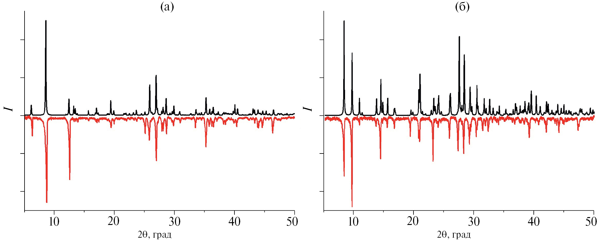 Рис. 4. Порошковые дифрактограммы соединений 1 (а) и 2 (б): черная – расчетная, красная – экспериментальная.