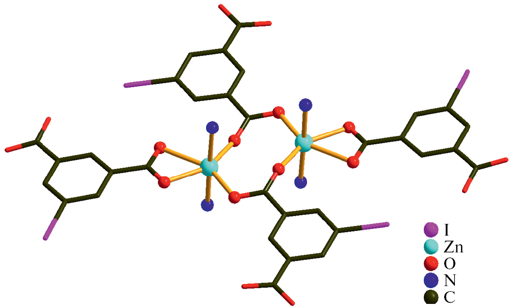 Ранее нами были представлены металл-органические координационные полимеры с 2-иодтерефталатным [46, 47] и 5-иодизофталатным лигандами [48]. В продолжение работы с этими кислотами нами получены новые трехмерные координационные полимеры [Zn2(2-I-bdc)2bpen]n (1) и [Zn(5-I-ipa)bpen]n (2), строение которых установлено методом РСА.