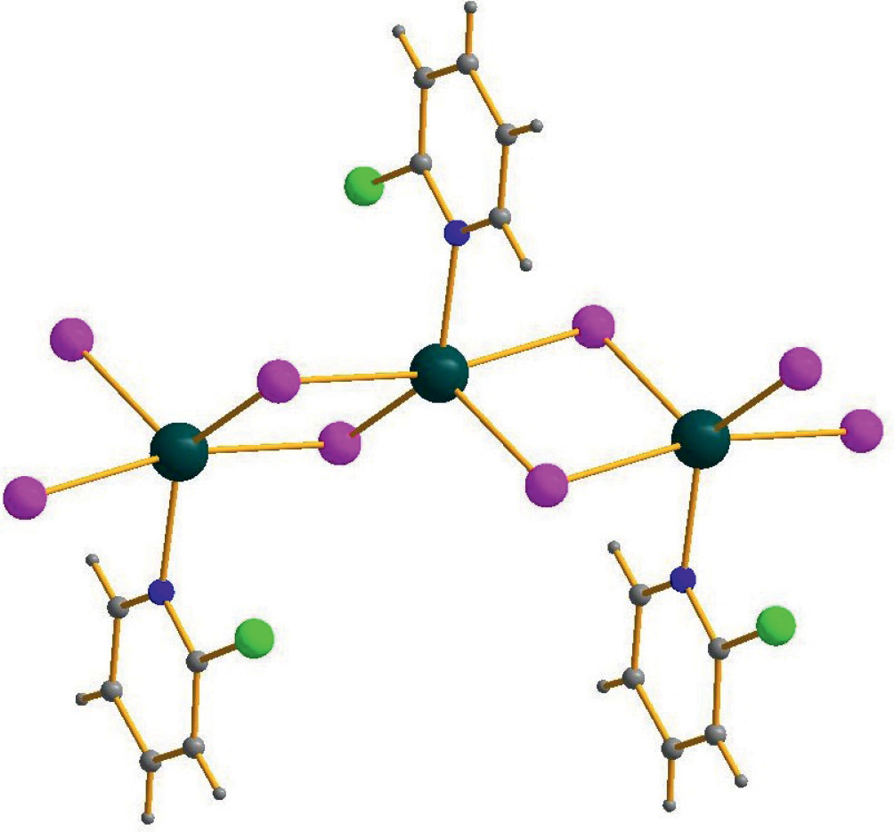 Рис. 1. Фрагмент полимерной цепочки {[(2-ClPy)CdI2]}n в структуре 1. Здесь и на рис. 2, 3 Cd показан черным цветом, C и H – серым, I – фиолетовым, N – синим, Cl – светло-зеленым.