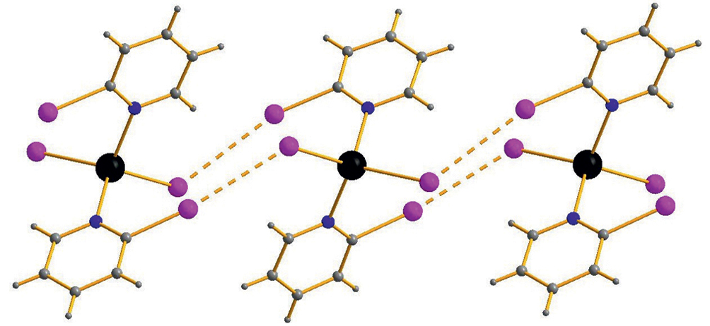 Комплексы 1 и 2 изоструктурны. В обоих случаях Cd(II) имеет КЧ = 5; окружение состоит из четырех атомов иода (Cd–I 2.765–3.091 и 2.775–3.095 Å соответственно) и одного атома азота 2-ClРу либо 2-BrPy (Cd–N 2.302 и 2.315 Å соответственно). Все иодидные лиганды являются μ2-мостиковыми, соединяя атомы Cd в бесконечные одномерные цепочки (рис. 1).