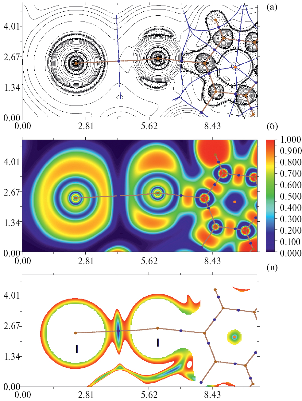 Рис. 4. Диаграмма контурных линий распределения лапласиана электронной плотности ∇2ρ(r), связевые пути и поверхности нулевого потока (а), изображения распределения функции локализации электронов (ELF, б) и приведенного градиента электронной плотности (RDG, в), соответствующие нековалентным взаимодействиям I···I в соединении 3. Критические точки связей (3, –1) показаны синим цветом, критические точки ядер (3, –3) – светло-коричневым цветом, критические точки цикла (3, +1) – оранжевым цветом. Единицы измерения длины – Å, шкала значений ELF и RDG представлена в атомных единицах.