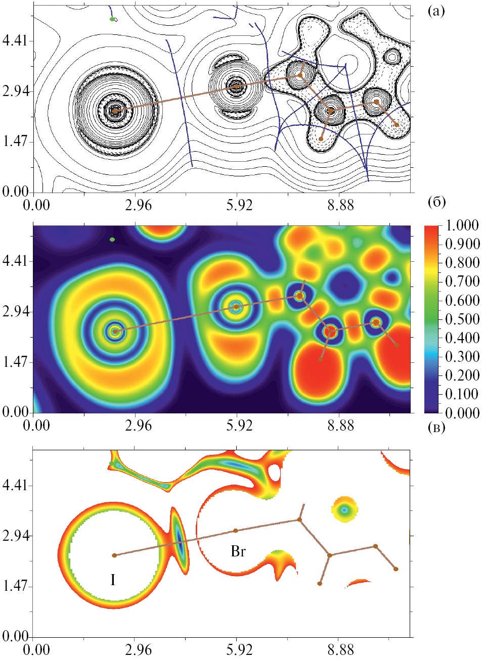 Рис. 5. Диаграмма контурных линий распределения лапласиана электронной плотности ∇2ρ(r), связевые пути и поверхности нулевого потока (а), изображения распределения функции локализации электронов (ELF, б) и приведенного градиента электронной плотности (RDG, в), соответствующие нековалентным взаимодействиям I···I в соединении 4. Критические точки связей (3, –1) показаны синим цветом, критические точки ядер (3, –3) – светло-коричневым цветом, критические точки цикла (3, +1) – оранжевым цветом. Единицы измерения длины – Å, шкала значений ELF и RDG представлена в атомных единицах.