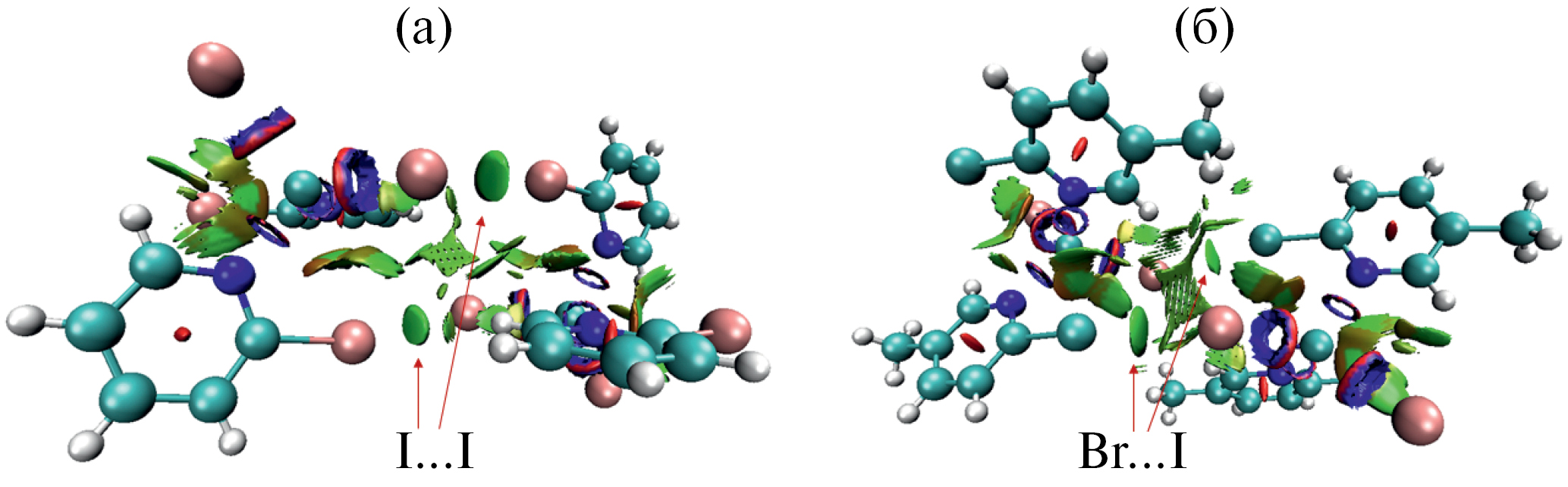 Рис. 6. Визуализация галогенных связей I···I и Br···I в кристаллах 3 (а) и 4 (б) в рамках формализма анализа нековалентных взаимодействий в модельных супрамолекулярных ассоциатах (NCI analysis).