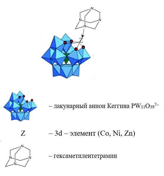 Известным способом получения металлооксидных наноматериалов является их синтез через промежуточные соединения – прекурсоры – с последующей их термообработкой. В качестве прекурсоров для получения соединений со структурой пирохлора и вольфрамовой бронзы используют гетерополивольфрамометаллаты с 3d-элементами в координационной сфере и их органические производные [40, 41]. Синтезированные таким способом продукты применяют в качестве функциональной части катализаторов, сенсоров, магнитов и других материалов [42–49]. В то же время сведений о комплексах гетерополиоксометаллатов с лигандом гексаметилентетрамином (ГМТА) нами в литературе не найдено.