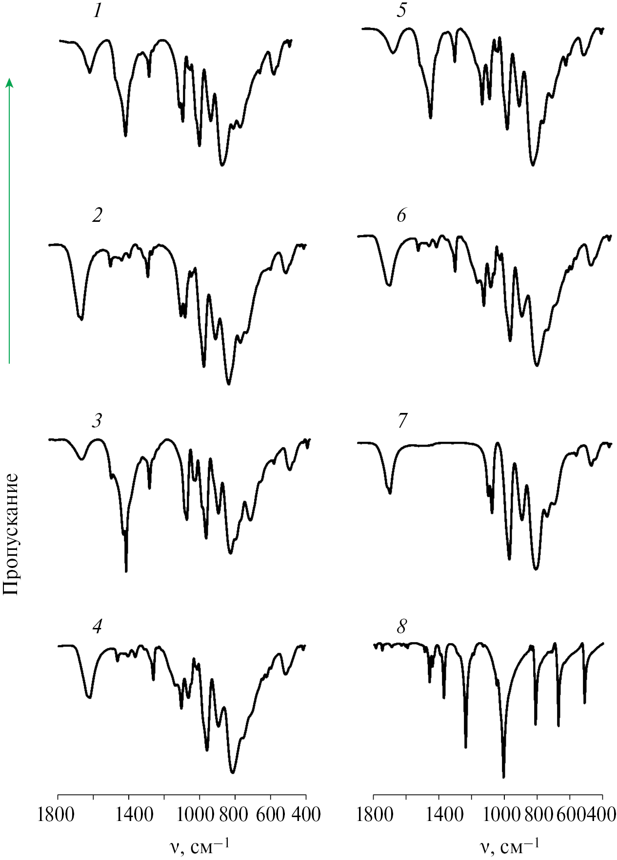 Рис. 1. ИК-спектры вольфрамофосфатометаллатов: 1 – (NH4)5[PW11O39Co(ГМТА)] ∙ 10H2O; 2 – Na5[PW11O39Co(ГМТА)] ∙ 13H2O; 3 – (NH4)5[PW11O39Ni(ГМТА)] ∙ 10H2O; 4 – Na5[PW11O39Ni(ГМТА)] ∙ 13H2O; 5 – (NH4)5[PW11O39Zn(ГМТА)] ∙ 10H2O; 6 – Na5[PW11O39Zn(ГМТА)] ∙ 13H2O; 7 – Na5[PW11O39Co(H2O)] ∙ 14H2O; 8 – ГМТА.