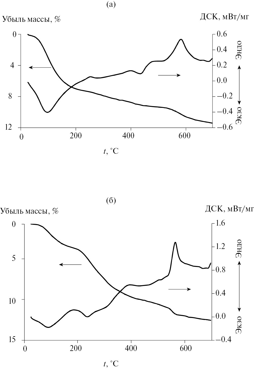 Рис. 3. Кривые термического анализа вольфрамофосфатокобальтатов: а – Na5[PW11O39Co(ГМТА)] ∙ 13H2O; б – (NH4)5[PW11O39Co(ГМТА)] ∙ 10H2O.