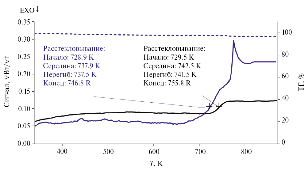 Результаты СТА для полученной нами стеклообразующей шихты 0.2Bi2O3–0.6B2O3–0.2BaO представлены на рис. 1. Температурное поведение теплоемкости с температурами характерных переходов между состояниями обозначено сплошной линией, термогравиметрическая (ТГ) потеря массы – пунктирной. Наличие расстеклования − перехода из стеклообразного в переохлажденное жидкое состояние при температурах ~745 K (синяя линия) – свидетельствует о стеклообразном состоянии субмикронных частиц со средним размером ~500 нм, что подтверждается методом динамического рассеяния света. Отметим, что уменьшение массы на ТГ-кривой не более 5–7 мас. % свидетельствует о достаточно полном превращении исходных прекурсоров в стекло Bi2O3–B2O3–BaO. Повышенный термический отклик образца, представленного синей кривой, обусловлен возможным разложением остатков наиболее устойчивого нитрата бария выше температуры расстекловывания, совмещенным со “слипанием” ультрадисперсных частиц.
