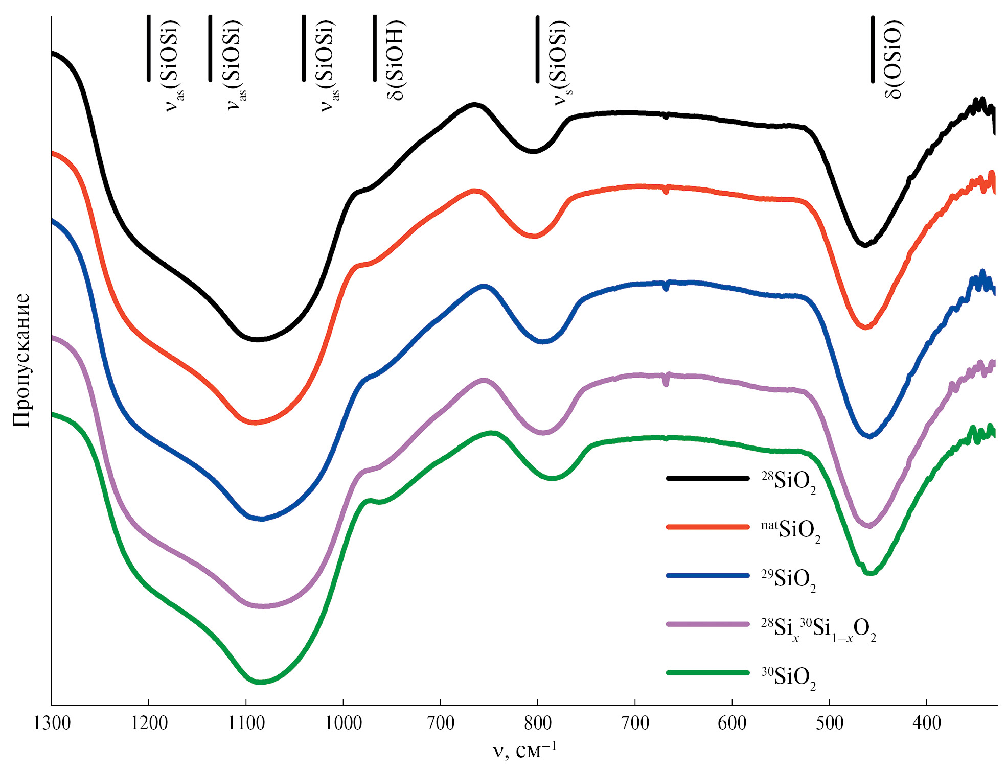 В работах [14, 15] охарактеризованы ИК-спектры кристаллического 30SiO2 (с обогащением по кремнию-30 96.5%) и natSiO2, в которых на длине волны 780 см–1 наблюдается смещение полос поглощения в коротковолновую область относительно кварца с изотопным обогащением по 28Si (обогащение по кремнию 99.8%) на 19 и 1 см–1 соответственно. Максимум при νas = 1160 см–1 в кварце с изотопным обогащением по 30Si смещен в коротковолновую область на 7–12 см–1 по сравнению с кварцем природного изотопного состава. Также для порошкообразного кварца с обогащением по 30Si по сравнению с образцом природного изотопного состава наблюдается смещение полосы поглощения при 780 см–1 в спектрах пропускания на 21 см–1 в коротковолновую область [7]. Такое смещение полос в ИК-спектрах, согласно [7, 14, 15, 16, 17], обусловлено изотопным обогащением по кремнию.