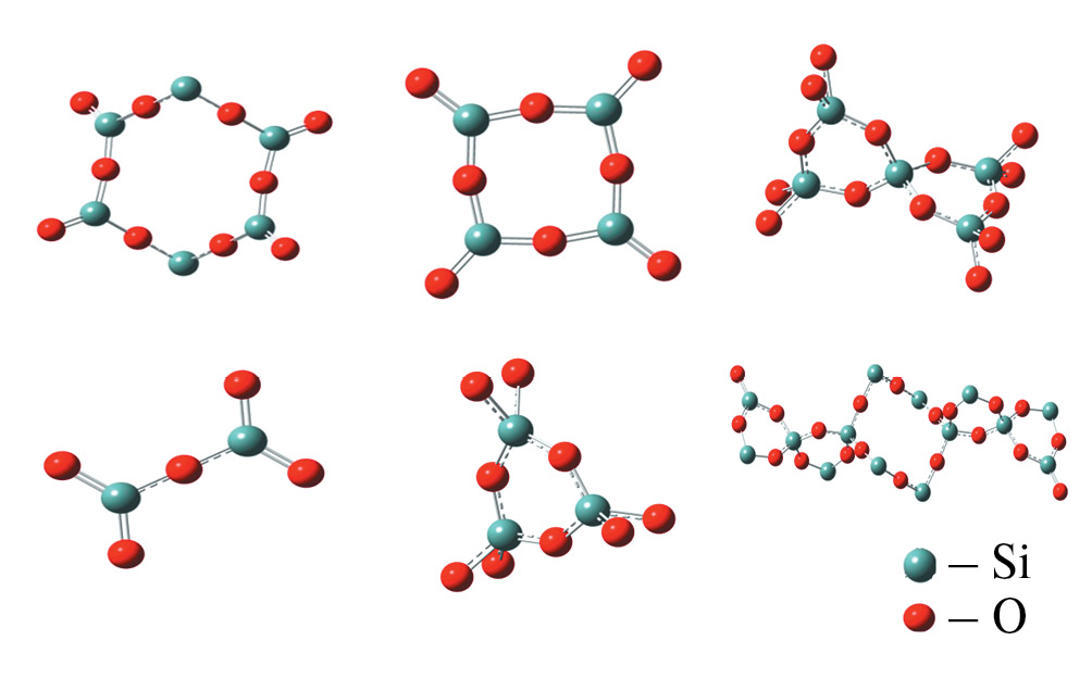 Расчетным методом DFT/uB3LYP/6–311g++G(3d2f,3p2d) оптимизированы структурные фрагменты диоксида кремния, колебания которых соответствуют полосам поглощения в наблюдаемых ИК-спектрах (рис. 6).