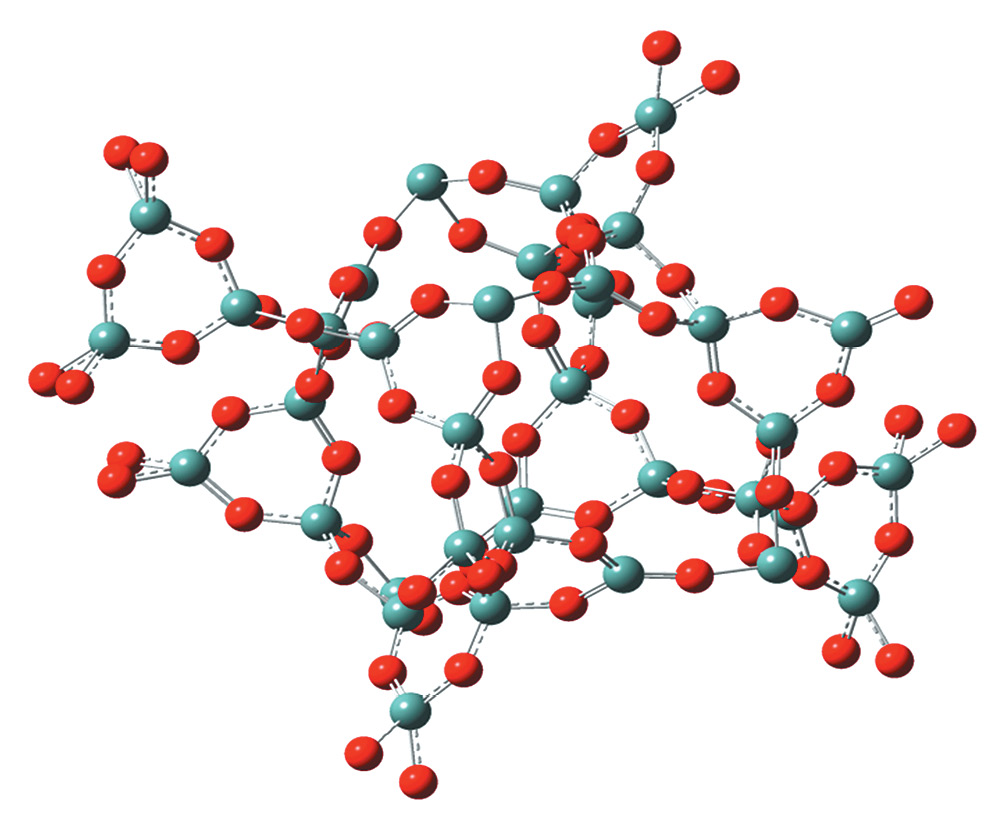 На примере фрагмента молекулы SiO2 (рис. 7) установлено, что для расчета колебаний достаточной является связка метода DFT с функционалом и базисным набором rwB97XD/6–311++G(3d2f,3p2d), поскольку она обладает достаточно хорошей сходимостью с экспериментальными значениями. При сопоставлении экспериментального и рассчитанного ИК-спектров обнаружено, что необходимо повысить интенсивность колебаний отдельных групп. Это можно сделать путем добавления фрагментов, но при добавлении фрагментов и приближении общего числа атомов к 100 единицам оптимизация структуры и расчет ИК-спектра становятся невозможными в связи с ограничениями, вызванными методом SCF (метод самосогласованного поля), который выполняется в методе DFT при оптимизации структуры. Поэтому было принято решение выполнить оптимизацию геометрии с использованием метода DFT/rwB97XD/6–311++G(3d2f,3p2d), а расчет ИК-спектра – с применением метода DFT/rwB97XD/lanl2d.