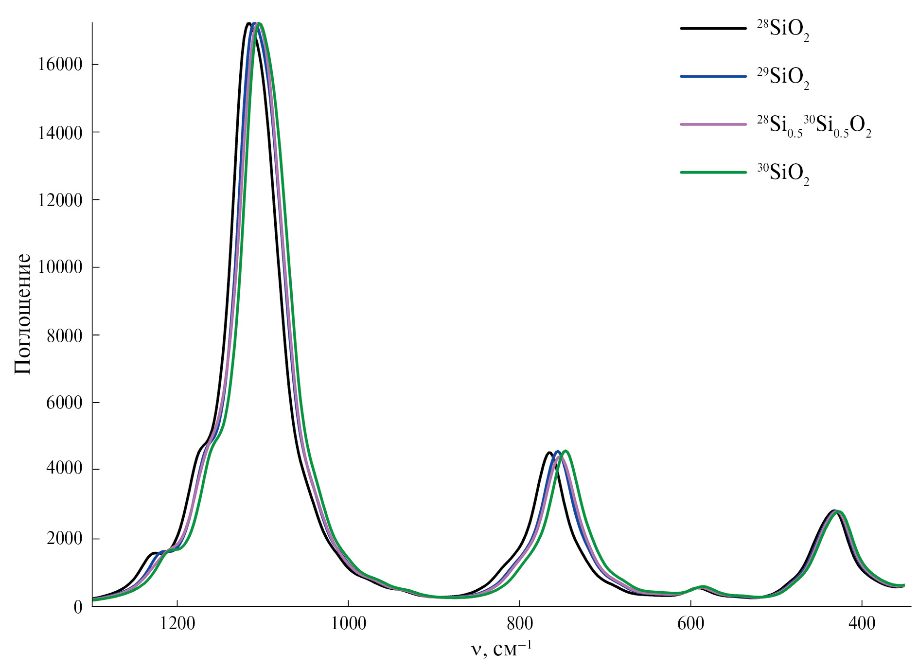 В работе [18] представлены данные о получении пленок диоксида кремния с изотопным обогащением по кислороду методом химического осаждения из паровой фазы с использованием 16О2 и 18О2. В спектрах поглощения наблюдается смещение полос поглощения на 9–77 см–1 в коротковолновую область при замещении 16O2 на 18O2.
