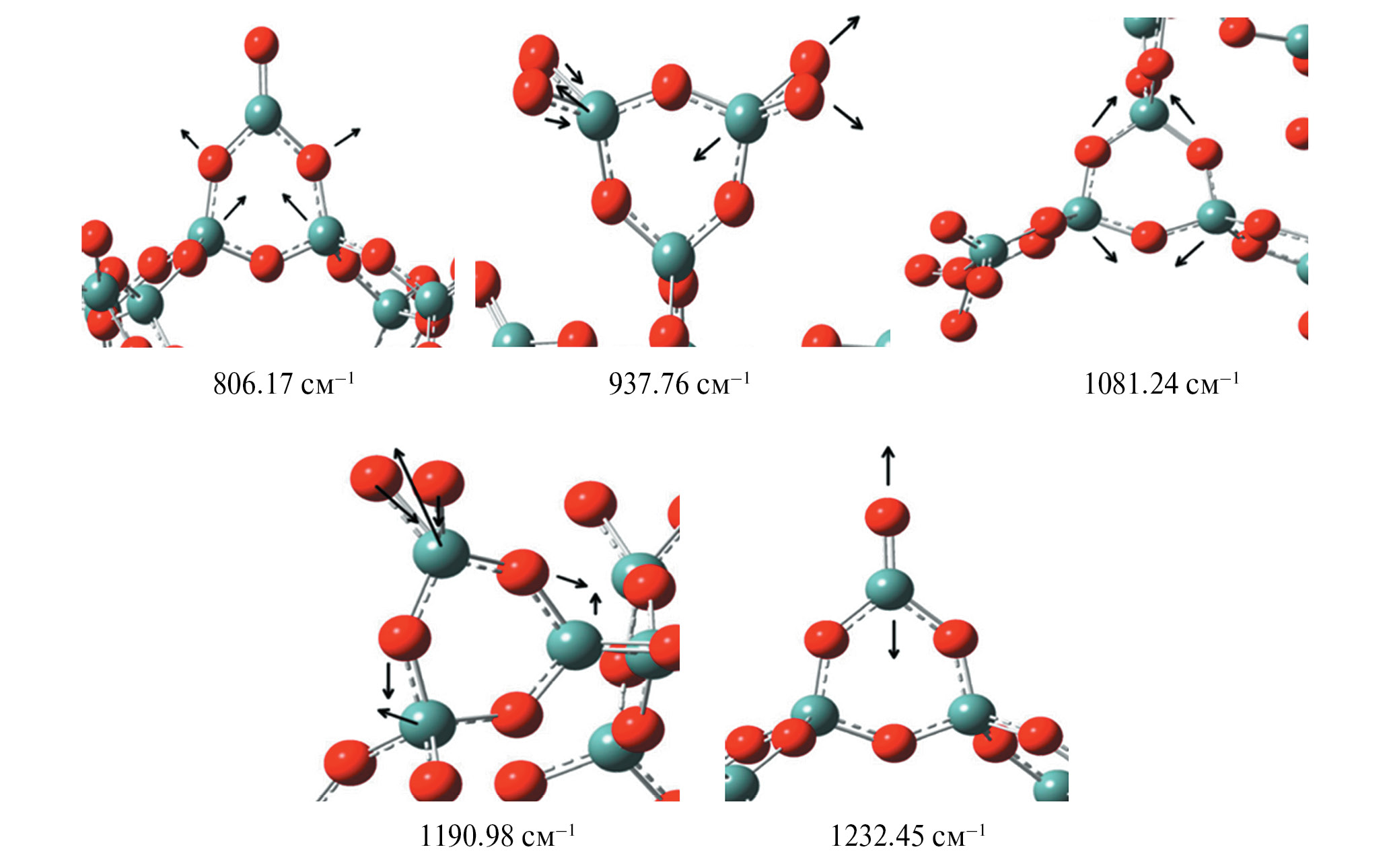При расчете методом DFT/rwB97XD/lanl2d положений полос в ИК-спектрах диоксида кремния, содержащего изотопы 28Si, 29Si и 30Si, на рис. 9 выделено пять основных волновых чисел, значения которых с высокой точностью коррелируют с экспериментальными данными, представленными в табл. 3. Следует отметить, что расчет волновых чисел основан на определении изменения потенциальной энергии атомов вдоль двух координат [25]. В соответствии с рассчитанной моделью SiO2 (рис. 8) на рис. 10 векторами показаны смещения атомов пяти основных колебаний. Колебание с волновым числом ν = 806.17 см–1 является валентным симметричным, поскольку наблюдается симметричное движение атомов кремния по связи Si–O–Si, что соответствует данным [23]. Волновое число ν = 937.76 см–1 в построенной модели определяется валентным симметричным колебанием. Данное волновое число проявляется только в одной группе (рис. 10б), не связанной с соседними атомами, что в реальной системе маловероятно. Следует отметить, что в [24] это колебание относят к деформационным колебаниям δSiOH, а в построенной нами модели отсутствуют какие-либо связи с водородом. Значения ν = 1081.24, 1190.98 и 1232.45 см–1 относятся к валентным асимметричным колебаниям, что совпадает с данными [23, 24].