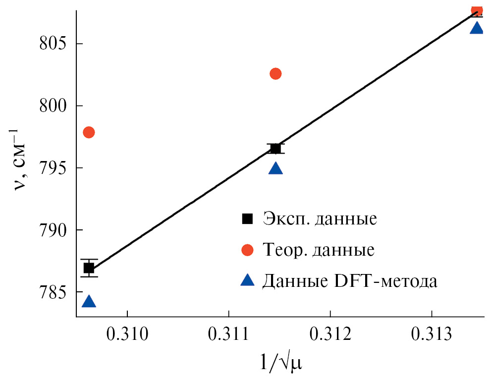 На рис. 11 приведены зависимости частот валентных симметричных колебаний, полученных из экспериментальных данных, предсказанных теоретически и рассчитанных методом DFT, от обратной величины приведенной массы 1/√(µ) образцов диоксида кремния. При сопоставлении полос поглощения наблюдается совпадение угла наклона с незначительным смещением прямой, рассчитанной методом DFT, относительно экспериментальных данных. В случае предсказательных расчетов, полученных из соотношения приведенных масс, наблюдается значительное отклонение угла наклона от экспериментальных данных. В результате можно сделать вывод о высокой степени соответствия экспериментальных данных и рассчитанных методом DFT.