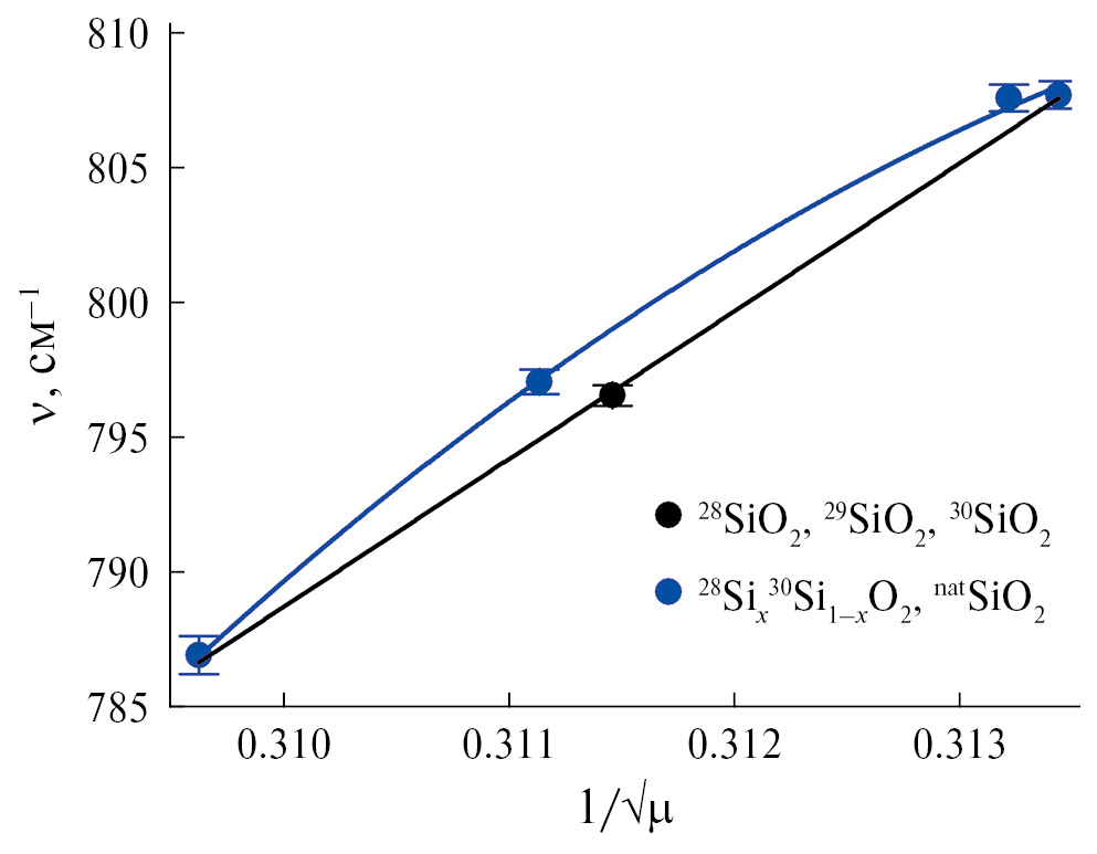 На рис. 12 представлена зависимость частоты валентных симметричных колебаний от обратной величины приведенной массы в образцах диоксида кремния различного изотопного состава. Образцы смеси кремния-28 и кремния-30 в составе диоксида кремния и природного изотопного состава, полученные в данной работе, демонстрируют значительное отклонение от линейной зависимости моноизотопных образцов диоксида кремния. Отклонение свойств веществ со смешанным изотопным составом от линейной зависимости известно в литературе [1, 2, 27]. Отклонения наблюдали в параметрах элементарной ячейки, электропроводности, значениях показателя преломления и КТР. Такие отклонения связаны с взаимодействием компонентов друг с другом [28]. Наблюдаемое в настоящей работе отклонение от линейной зависимости для смесей указывает на ненулевую энтальпию смешивания и неидеальное поведение [29, 30].