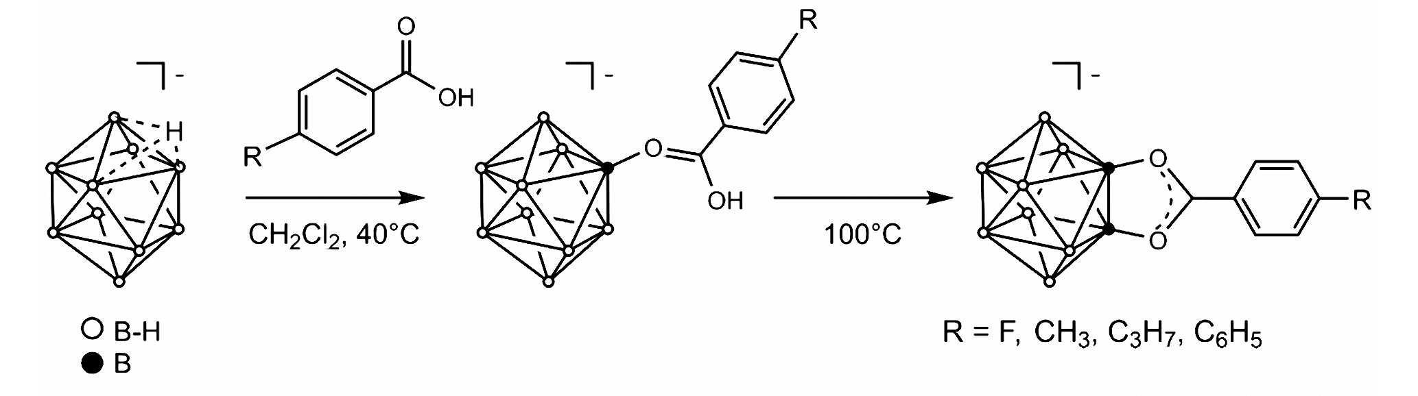 Для клозо-систем долгое время были известны только карбоксониевые производные клозо-декаборатного аниона [2,6-B10H8O2CR]– с алифатическими кислотами CH3COOH и C2H5COOH [38–40]. Позднее в работах [41, 42] были получены производные клозо-декаборатного и клозо-додекаборатного анионов на основе бензойной кислоты [BnHn–2O2CC6H5]–n, где n = 10, 12.