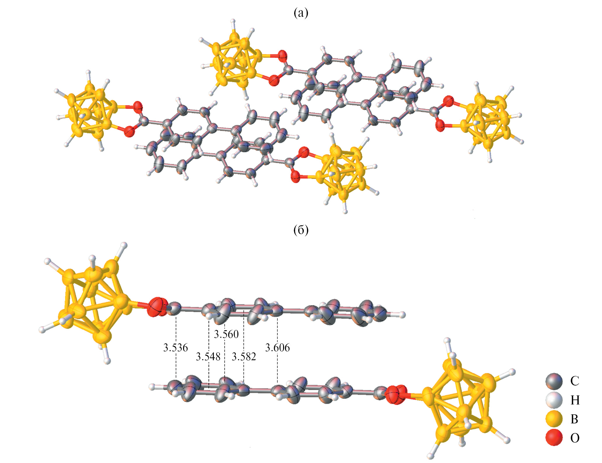 За счет плоских ароматических заместителей анионы [2,6-B10H8O2CC6H4–C6H5]– образуют димерные структуры. Однако бифенильные фрагменты двух анионов принимают не заслоненную конформацию, а сдвинуты относительно друг друга как вдоль оси, проходящей через связь фенил–фенил, так и вдоль оси, перпендикулярной ей (рис. 1а). Расстояния бифенил–бифенил находятся в диапазоне 3.536–3.606 Å (рис. 1б).