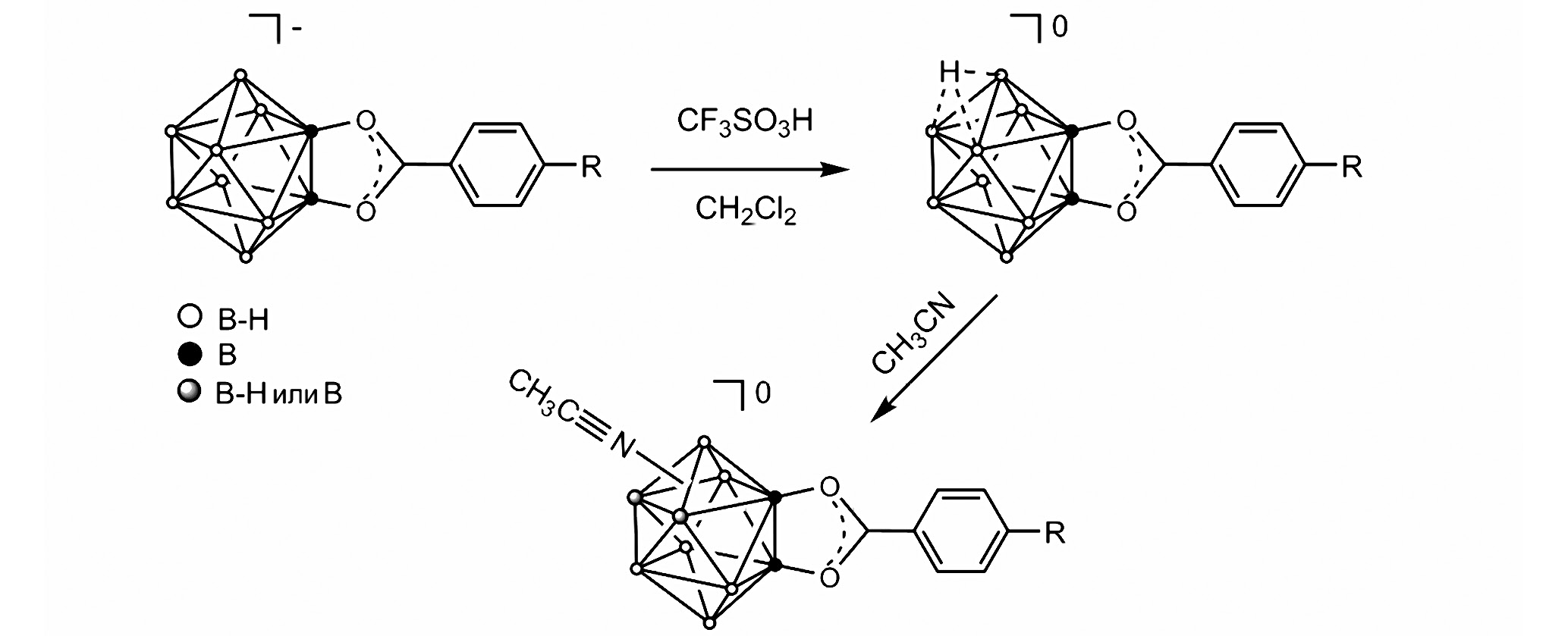 Как и в случае ониевых соединений, карбоксониевые ионы эффективно стабилизируются кластерными анионами бора. Одними из первых были исследованы карбоксониевые производные на основе арахно-боранов. Например, взаимодействие солей аниона B3H8– с карбоновыми кислотами в присутствии I2 или AlCl3 приводит к замещению двух атомов водорода и образованию бициклической цвиттер-ионной структуры [B3H6O2CR]0 [36]. Кроме того, было обнаружено, что продукты вида [B3H6O2CR]0 могут быть получены взаимодействием тетраборана(10) B4H10 с карбоновыми кислотами. Для карборановых систем также известны подобные дизамещенные карбоксониевые производные. Так, взаимодействие бис-дикарболлида кобальта с уксусным ангидридом в присутствии серной кислоты приводит к образованию продукта, в котором карбоксониевый фрагмент соединяет два карборановых лиганда [37]. Другой подход основан на модификации уже введенных в карборановый остов заместителей (гидроксигрупп) с помощью того же уксусного ангидрида.