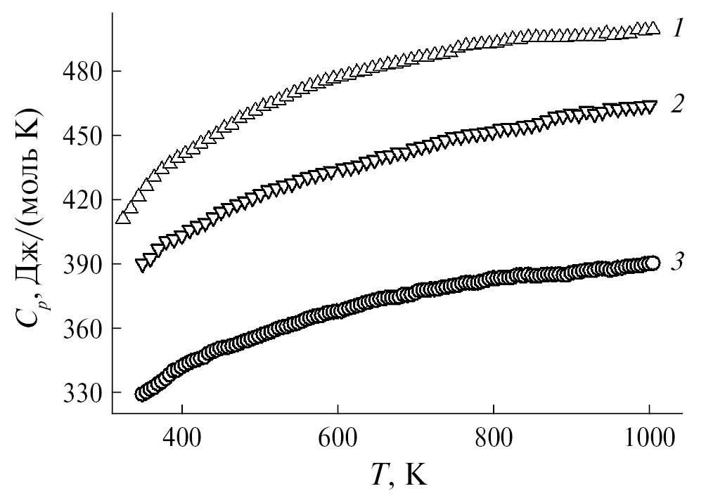 Высокотемпературную теплоемкость Ca3Y2Ge3O12 измеряли с помощью дифференциального сканирующего калориметра STA 449 C Jupiter (Netzsch, Германия) методом непрерывного нагревания в интервале температур 320–1000 K с шагом 5 K в атмосфере воздуха в закрытых платиновых тиглях, используя специальные держатели TG+DSC 6.226.1–72+S. Методика измерения теплоемкости подробно описана в работах [15, 16]. Погрешность измерения теплоемкости не превышала 2%. Обработку полученных экспериментальных данных проводили при помощи лицензионной программы Systat Sigma Plot 12.