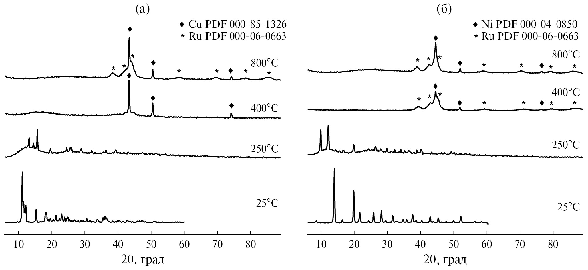 Повышение конечной температуры термолиза [Cu(im)4][RuNOCl5] до 400°C приводит к полному исчезновению рефлексов промежуточных соединений, появлению пиков металлической меди и незначительному подъему фона в области рефлексов металлического рутения. При нагреве до 800°C помимо пиков металлической меди (a = 3.615 Å, V/Z = 11.81 Å3, область когерентного рассеяния (ОКР) 23–30 нм) становятся хорошо видны пики ГПУ-фазы рутения (a = 2.706, c = 4.282 Å, V/Z = 13.57 Å3, ОКР 3–4 нм) (рис. 7a).