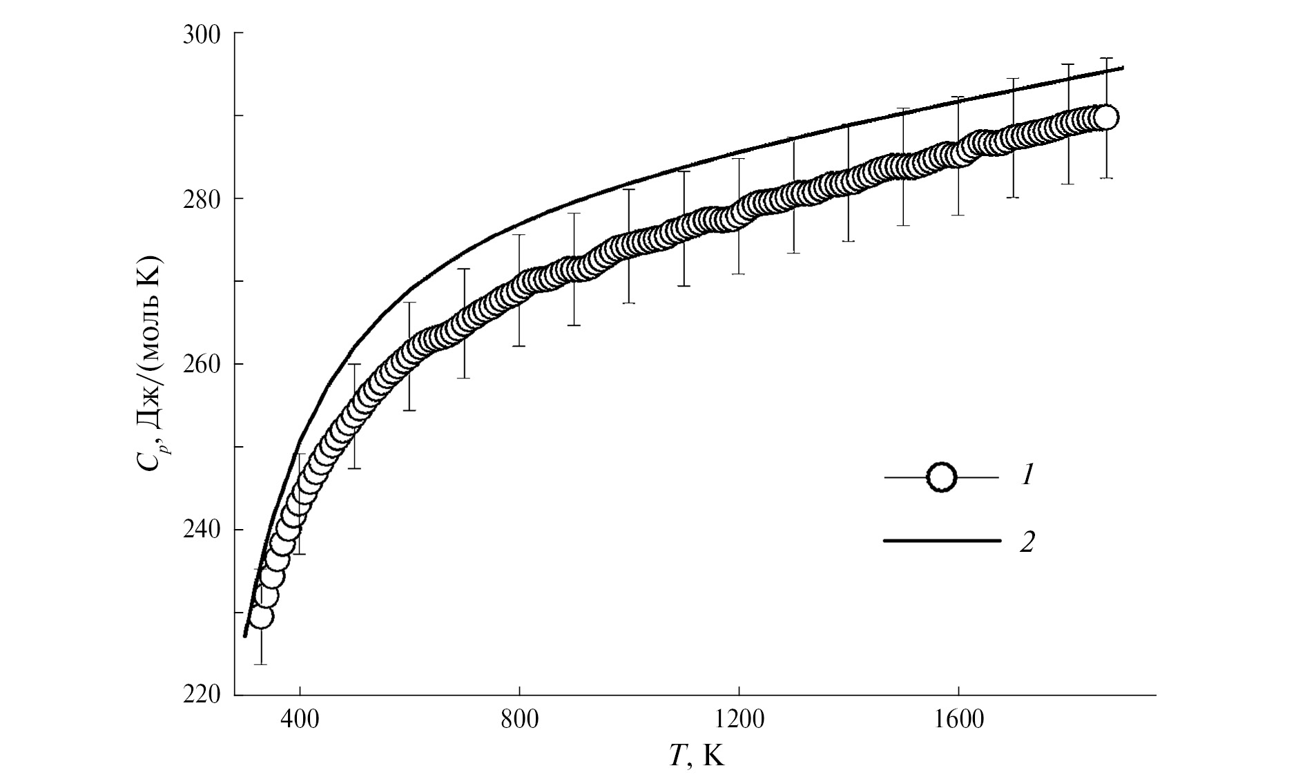 Из рисунка видно, что модельная теплоемкость Tm2Ti2O7, рассчитанная из теплоемкостей простых оксидов Tm2O3 [35] и TiO2 [36] (кривая 2, рис. 6) несколько завышена по сравнению с экспериментально измеренной (кривая 1), однако находится в пределах доверительного интервала ±2.5 точности метода ДСК.