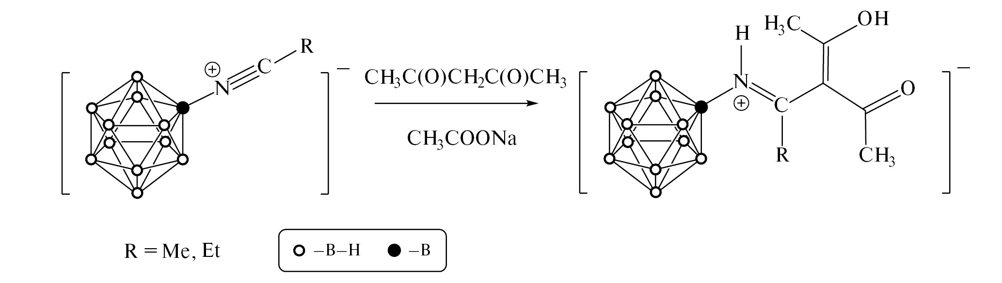 На данный момент известно лишь несколько примеров нуклеофильного присоединения С-нуклеофилов к нитрилиевым производным клозо-боратных анионов. Отдельный интерес представляют соединения с активированной метиленовой группой. При использовании в качестве нуклеофилов малоосновных карбоанионов, например ацетилацетонат-аниона, которые могут быть депротонированы мягкими основаниями, такими как ацетат натрия, процесс нуклеофильного присоединения к анионам [B12H11NCR]– протекает без образования побочных продуктов гидролиза (рис. 1).