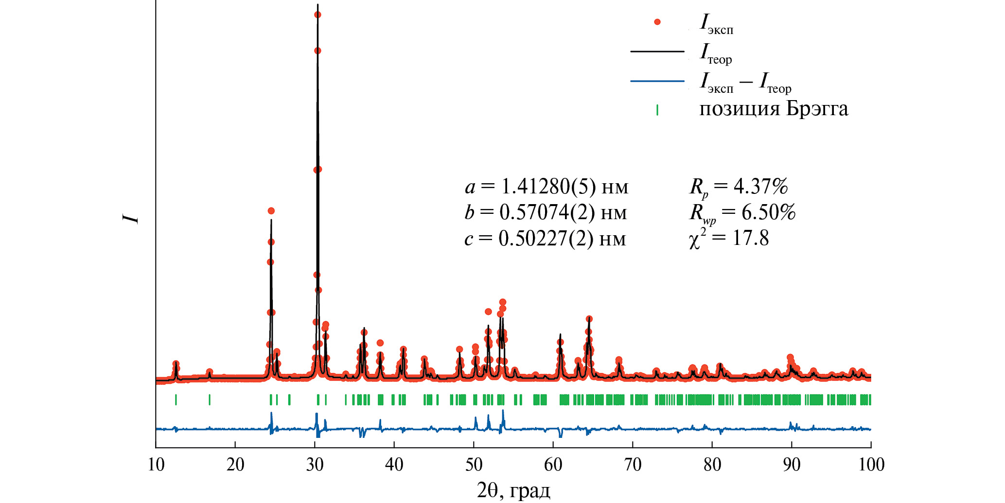 Примечание. λCuKα = 1.54056 Å, t = 20°C, α = β = γ = 90°, Z = 4, a = 1.41280(5), b = 0.57074(2), c = 0.50227(2) нм, Vяч = 0.4050 нм3.
