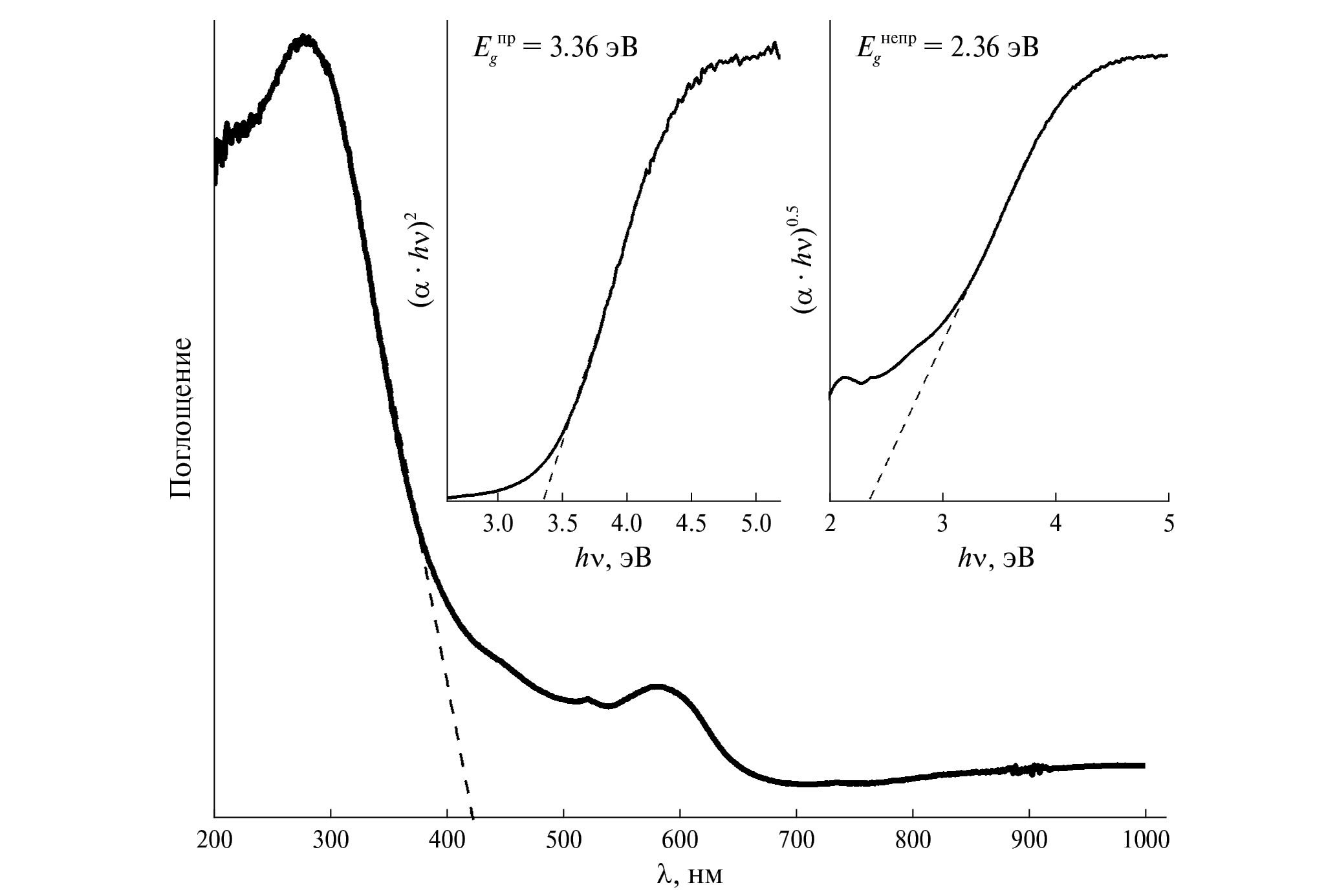 Рис. 3. Спектры поглощения и зависимости Тауца для прямого и непрямого разрешенных электронных переходов (вставки) для (Mg0.2Cu0.2Ni0.2Co0.2Zn0.2)Nb2O6.