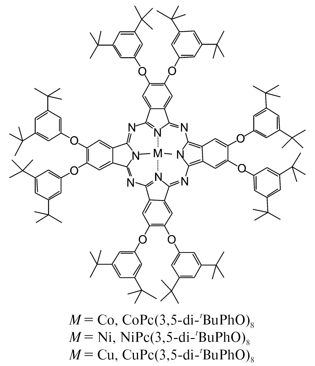 С целью детального количественного описания эффекта центрального атома металла MPc в его кислотно-основных свойствах в настоящей работе синтезированы органорастворимые (октакис(3,5-ди-трет-бутилфенокси)фталоцианинато)кобальт(II) (CoPc(3,5-di-tBuPhO)8), (октакис(3,5-ди-трет-бутилфенокси)фталоцианинато)никель(II) (NiPc(3,5-di-tBuPhO)8) и (октакис(3,5-ди-трет-бутилфенокси)фталоцианинато)медь(II) (CuPc(3,5-di-tBuPhO)8) (рис. 1) и определена природа и устойчивость их протонированных форм в зависимости от состава смешанного протонодонорного растворителя дихлорметан–трифторуксусная кислота. Выбор Co, Ni и Cu в качестве комплексообразователей обусловлен увеличением их валентных электронов в d-оболочке, что может оказать влияние на вклад дативных π-взаимодействий в связывание макроцикла и, следовательно, кислотно-основные свойства этих металлофталоцианинов.
