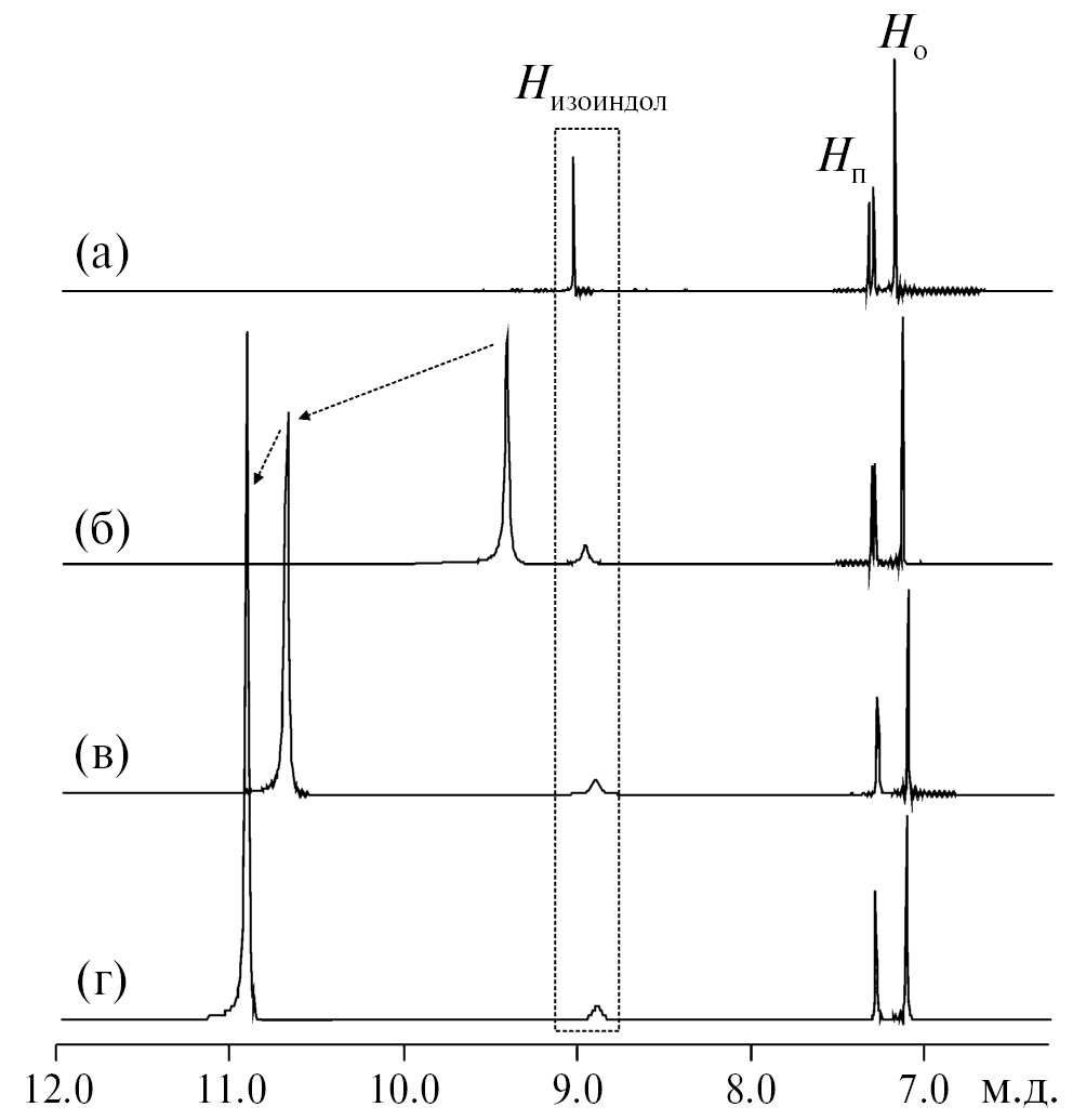 Рис. 5. 1Н ЯМР-спектр NiPc(3,5-di-tBuPh)8 (7.8 × 10–3 моль/л) в CDCl3 (а) и в CDCl3 с добавкой 0.36 (б), 1.6 (в) и 2.9 моль/л CF3COOH (г)