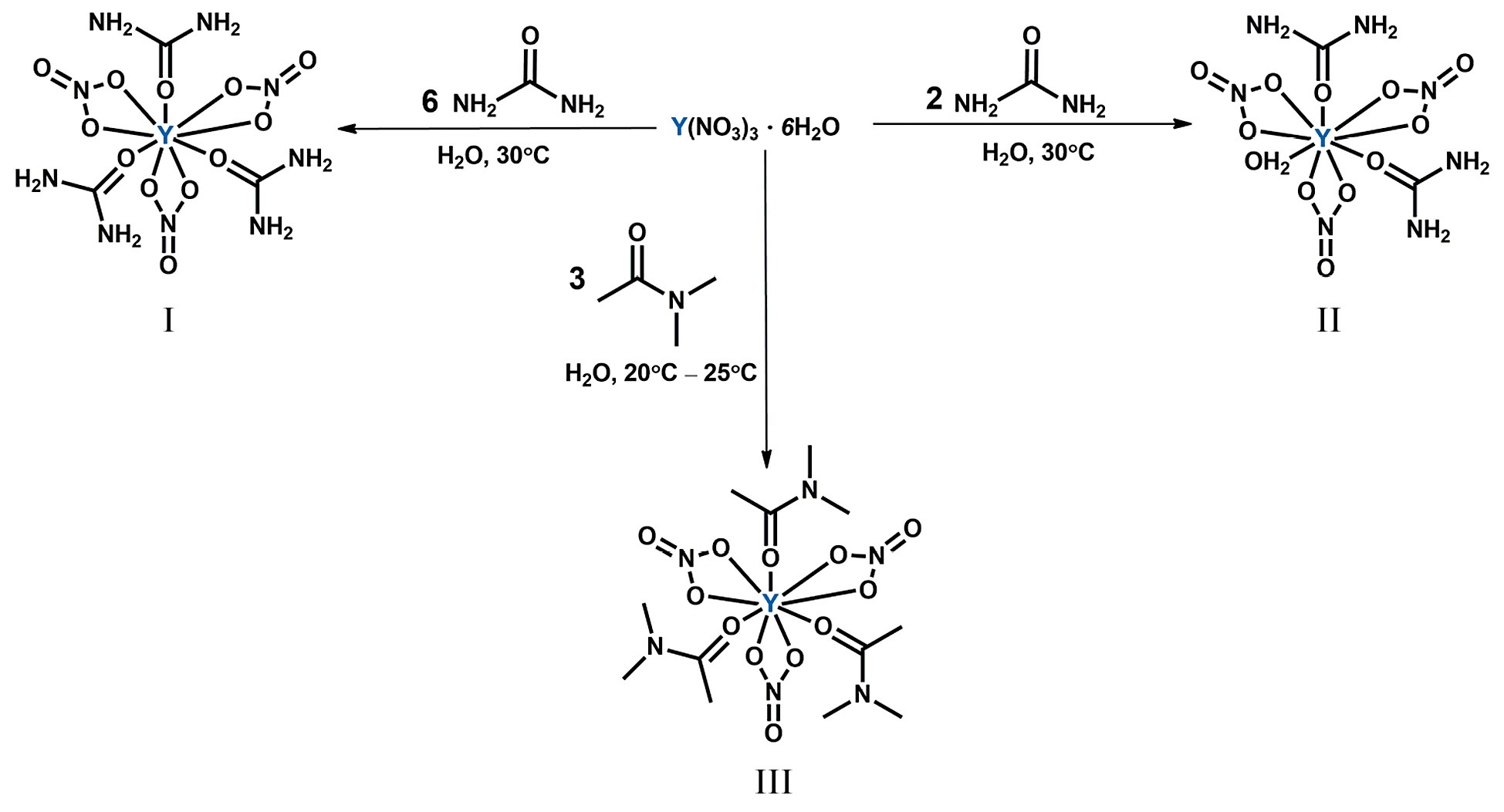 Синтез координационных соединений осуществляли путем взаимодействия Y(NO3)3 · 6H2O (х. ч., РЕАХИМ, Россия) с карбамидом (СH4N2O, 99.8%) или N,N-диметилацетамидом (C4H9NO, 99.8%) в различных мольных соотношениях; для гомогенизации полученных смесей добавляли минимальное количество дистиллированной воды.