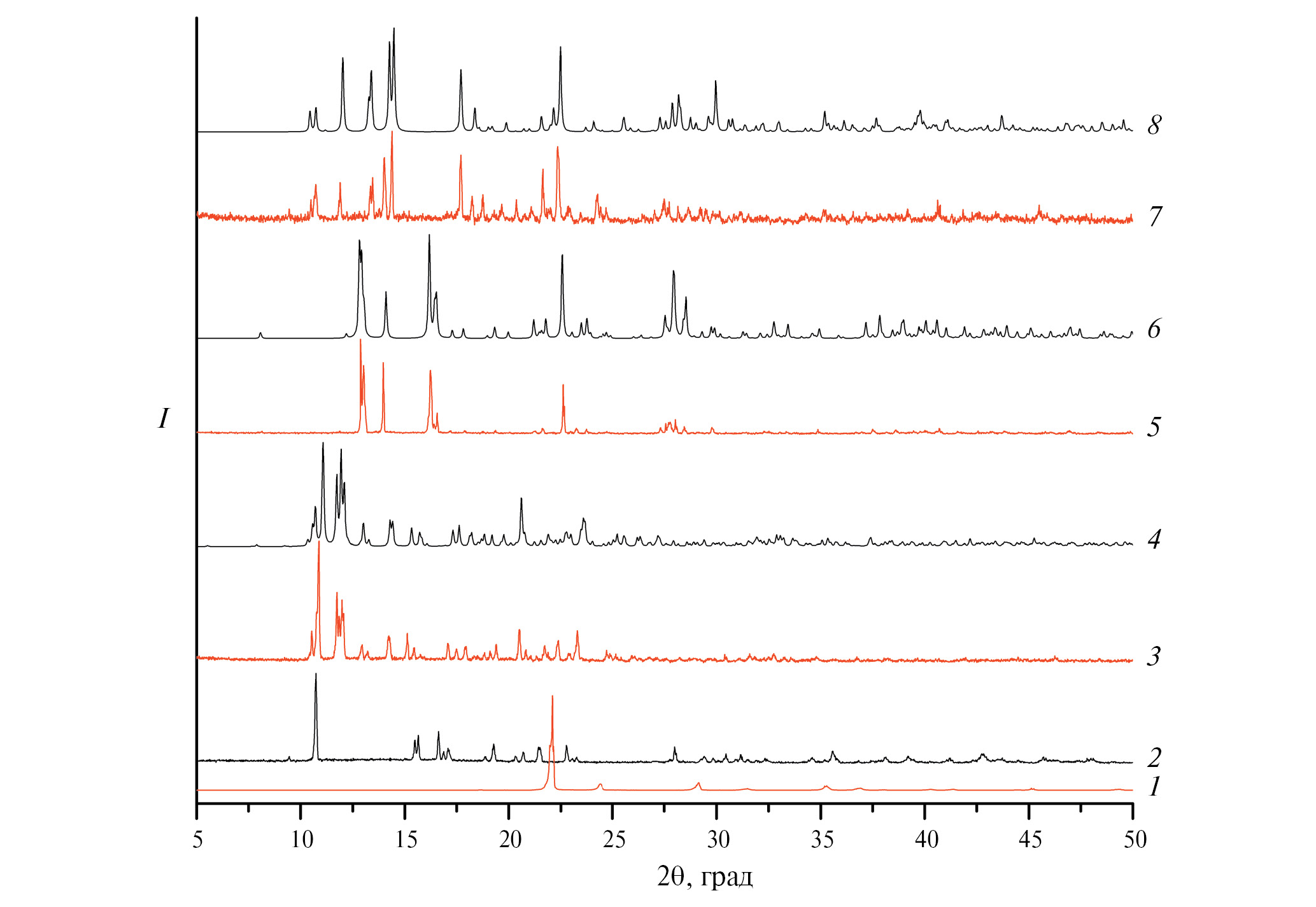 Рис. 1. Дифрактограммы прекурсоров и выделенных комплексов: 1 – Ur, 2 – Y(NO3)3 · 6H2O, 3 – III (эксп.), 4 – III (теор.), 5 – I (эксп.), 6 – I (теор.), 7 – II (эксп.), 8 – II (теор.).