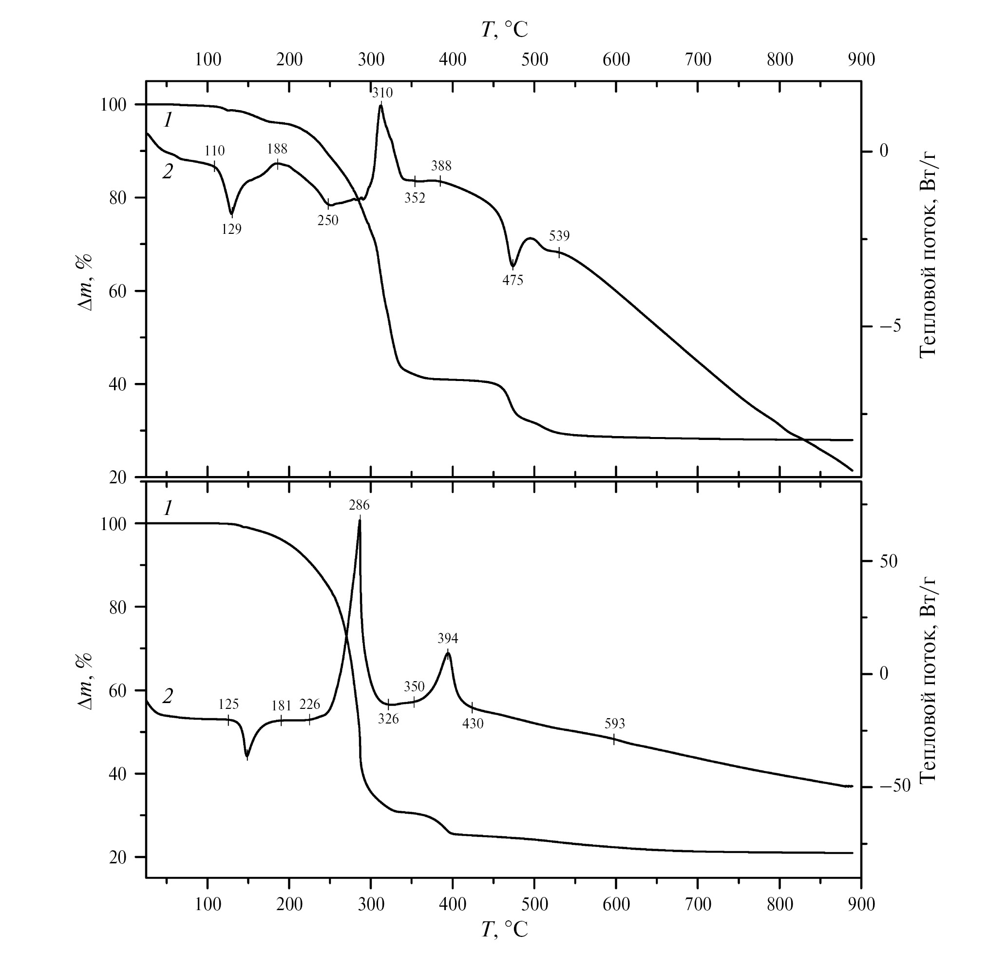 Комплексный термический анализ проводили на приборах Q500 и Q100 (Intertech, США). Для проведения термогравиметрического анализа (ТГА) и дифференциальной сканирующей калориметрии (ДСК) образцы готовили по стандартной методике. Все измерения проводили в атмосфере воздуха (100 мл/мин), линейная скорость нагрева и охлаждения составляла 10 град/мин, погрешность измерения 0.01–0.02°C.